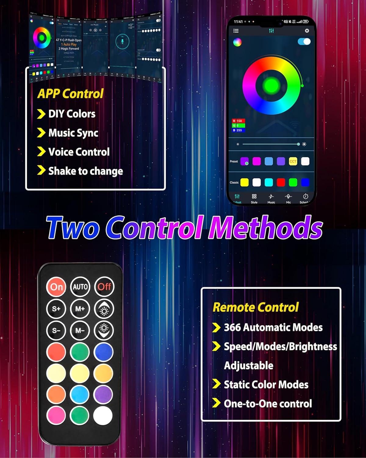 Dynamic RGB Lighting & Dual Control: Enjoy 360° spiral illumination with 366+ preset modes (strobe, chase, pulse) and customizable colors via a user-friendly app or remote. Sync lights to music beats, adjust brightness, speed, and save DIY patterns for personalized effects. The app also offers timing functions and group control for synchronized displays with multiple devices