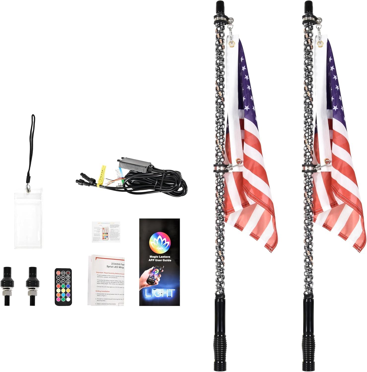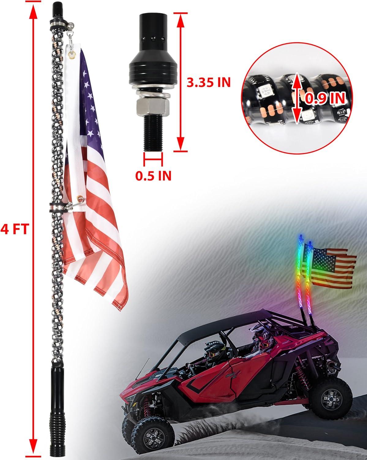 Universal Compatibility & Easy Installation: Designed for UTVs, ATVs, trucks, boats, and more (including RZR, Maverick X3, Talon 1000, RMAX, YXZ 1000, Teryx, Sportsman, Outlander, etc). Each set includes mounting hardware, flags, and step-by-step instructions. The 12mm aluminum base fits most standard whip mounts, and the quick-release mechanism allows effortless installation or removal, while plug-and-play wiring simplifies setup