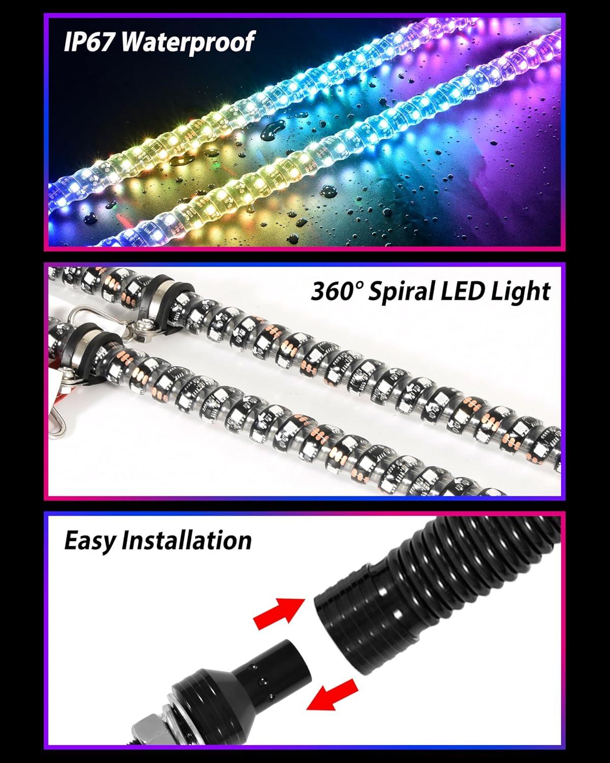 IP67 Waterproof Rating & High Visibility: Wrapped in bendable EVA/silicone tubing, these whip lights are IP67 waterproof, shielding them from dust, dirt, and splashes. The transparent heat shrink coating maintains flexibility while protecting the internal components. High brightness 5050 SMD LEDs improve visibility during day/night rides, group expeditions, or marine use