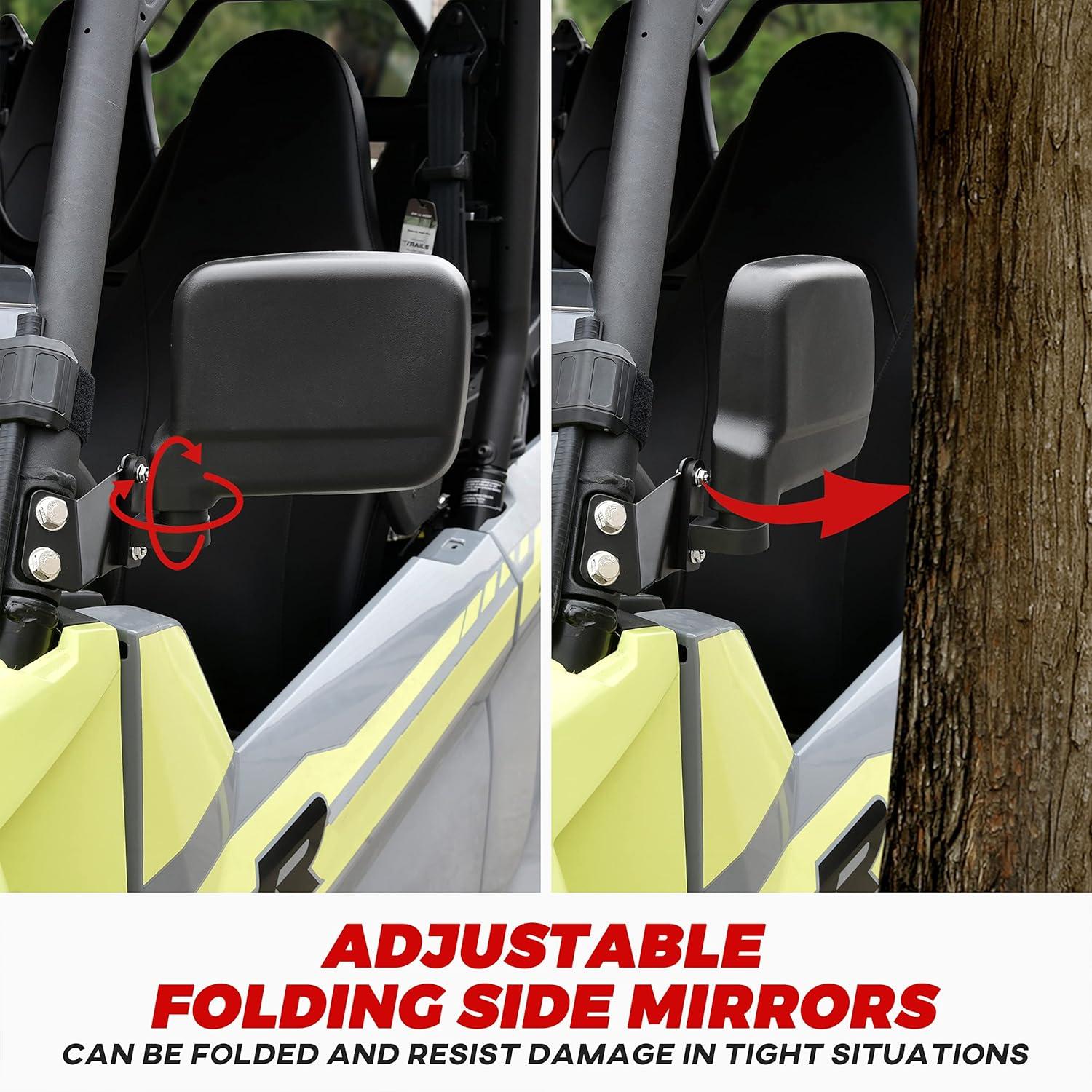 Adjustable folding side mirrors, offers increased visibility; Composed with adjustable mirror and breakaway hinge mounts, which can be folded and resist damage in tight situations