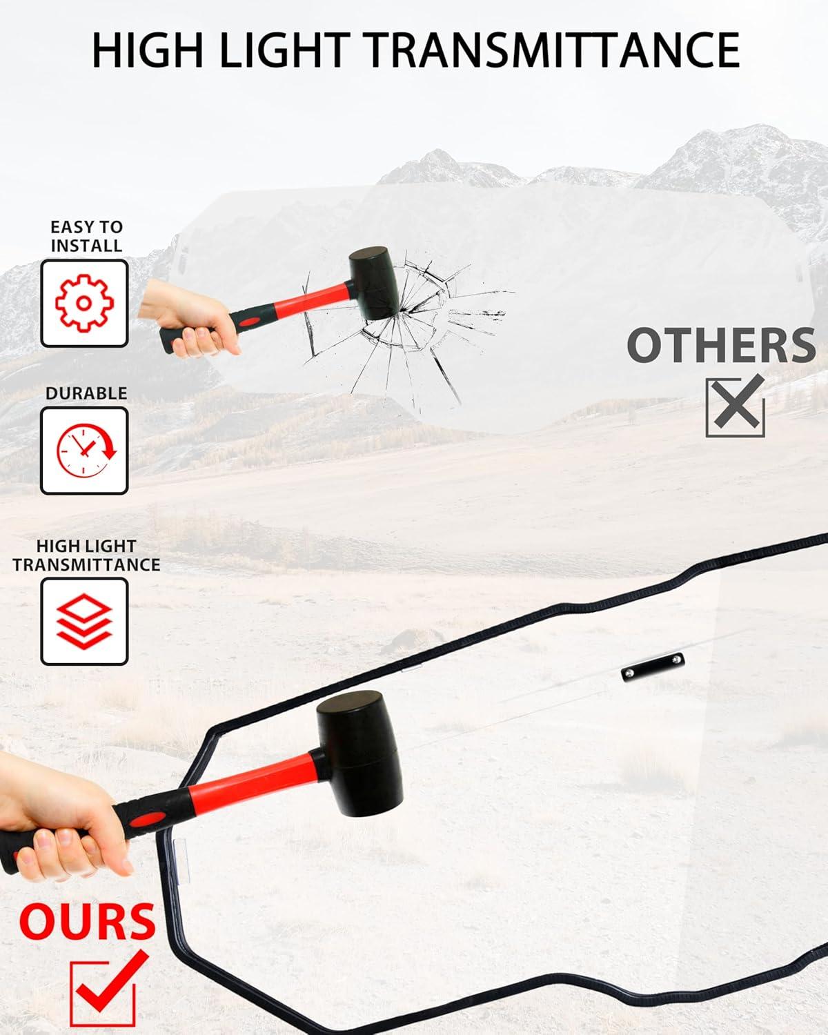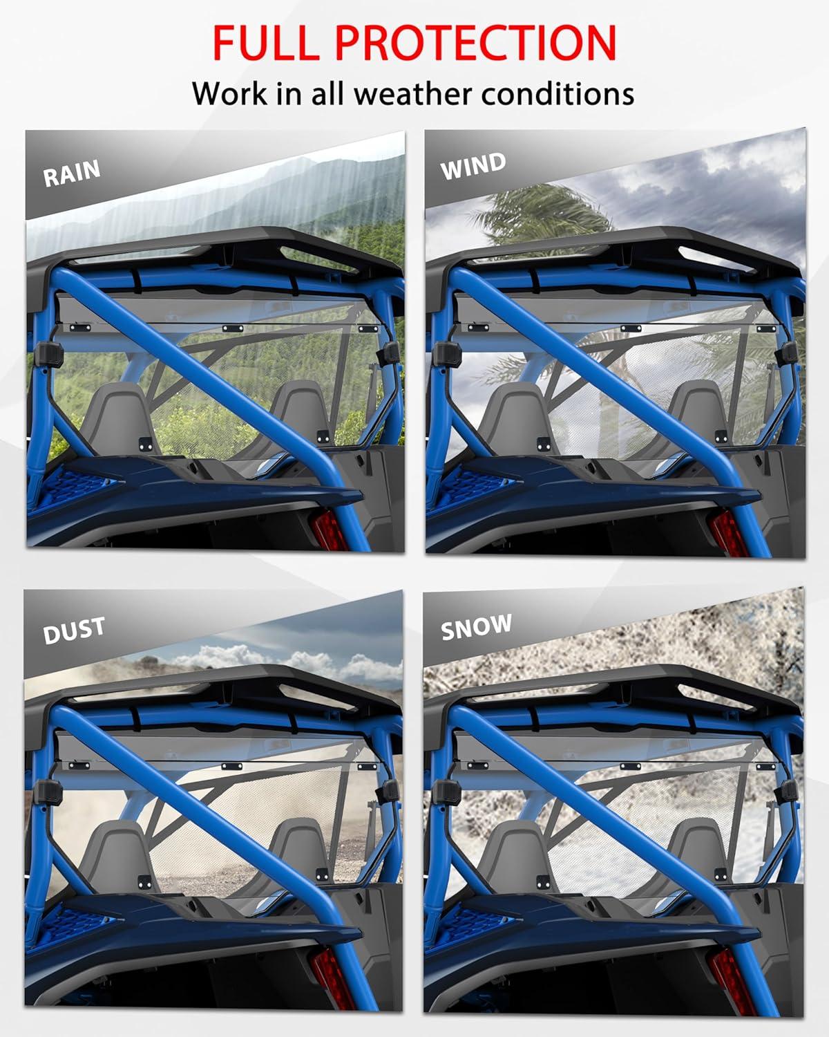 All-Weather Protection & Comfort: Prevents wind, leaves, and debris from flying directly into the cab, keeps the interior of the UTV dry and tidy. Besides, the windshield keeps you warm in winter, and prevents dust and rain in summer