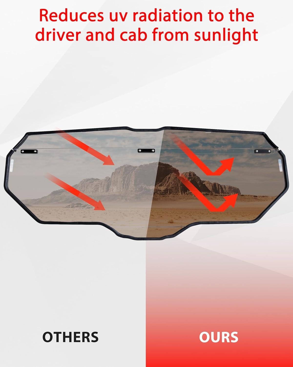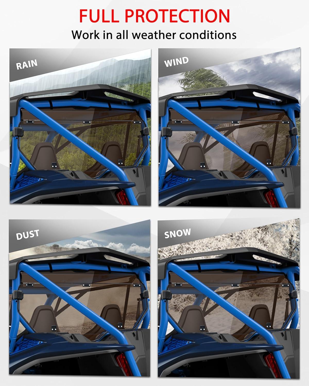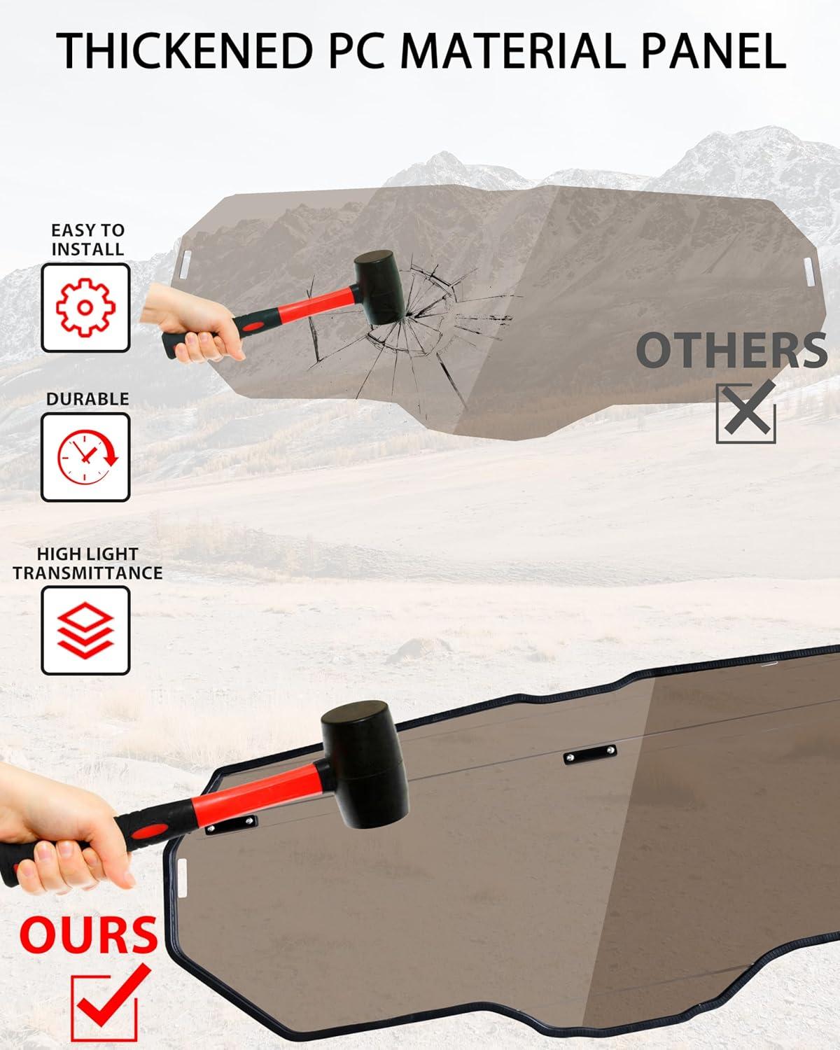 All-Weather Protection & Comfort: Prevents wind, leaves, and debris from flying directly into the cab, keeps the interior of the UTV dry and tidy. Besides, the windshield keeps you warm in winter, and prevents dust and rain in summer