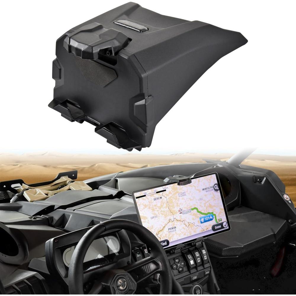 Provide extra storage while take up no space, directly installed above the dash, a small storage box with an GPS tablet phone holder; Add storage space and it is easier to reach the dash 12V outlet for device charging