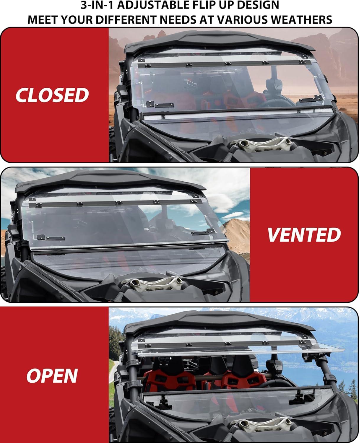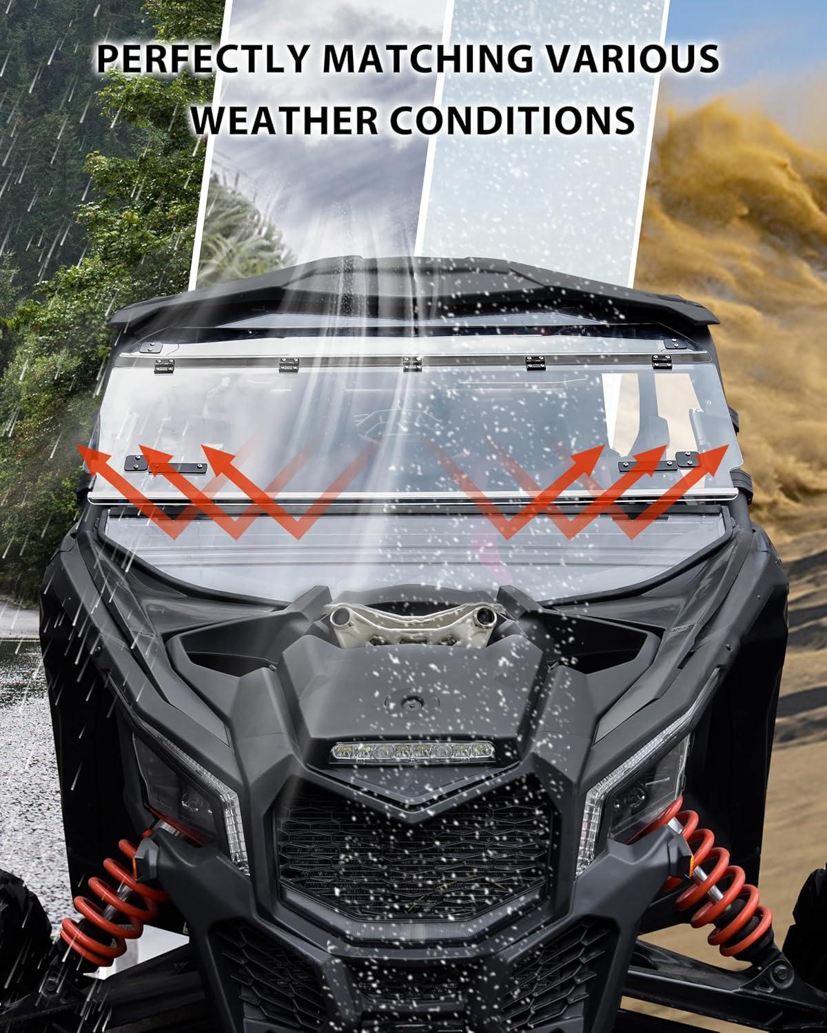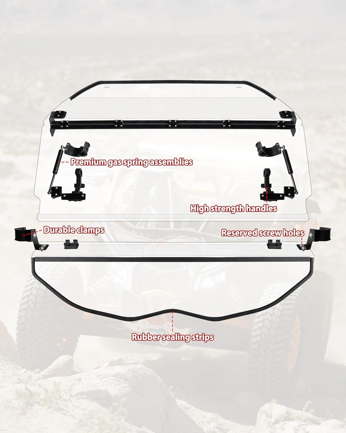 DURABLE ACCESSORIES: The flip-up windshield operates effortlessly via gas spring assemblies, providing sturdy support for rough terrain; Two handlebars and brackets make the windshield more stable when closed. Reinforced with durable rubber strips, it enhances friction, absorbs shocks, and minimizes damage risks to the windshield. These strips also serve noise-reduction roles, dampening disruptive vibrations and reducing harsh wind noise