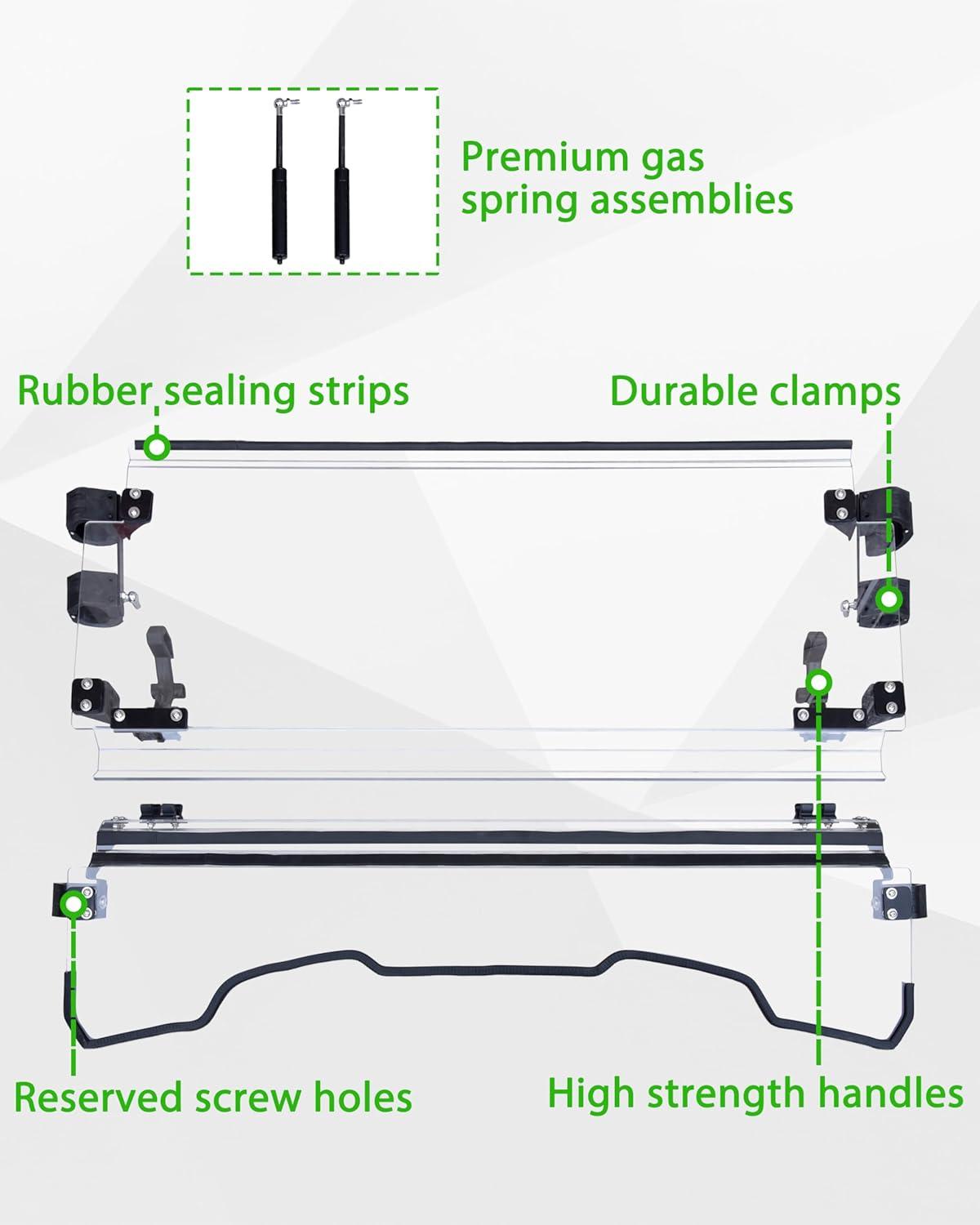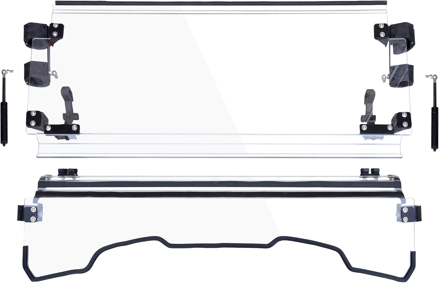 Durable Accessories: The flip-up windshield operates effortlessly via gas spring assemblies, providing sturdy support for rough terrain; Two handlebars and brackets make the windshield more stable when closed. Reinforced with durable rubber strips, it enhances friction, absorbs shocks, and minimizes damage risks to the windshield. These strips also serve noise-reduction roles, dampening disruptive vibrations and reducing harsh wind noise