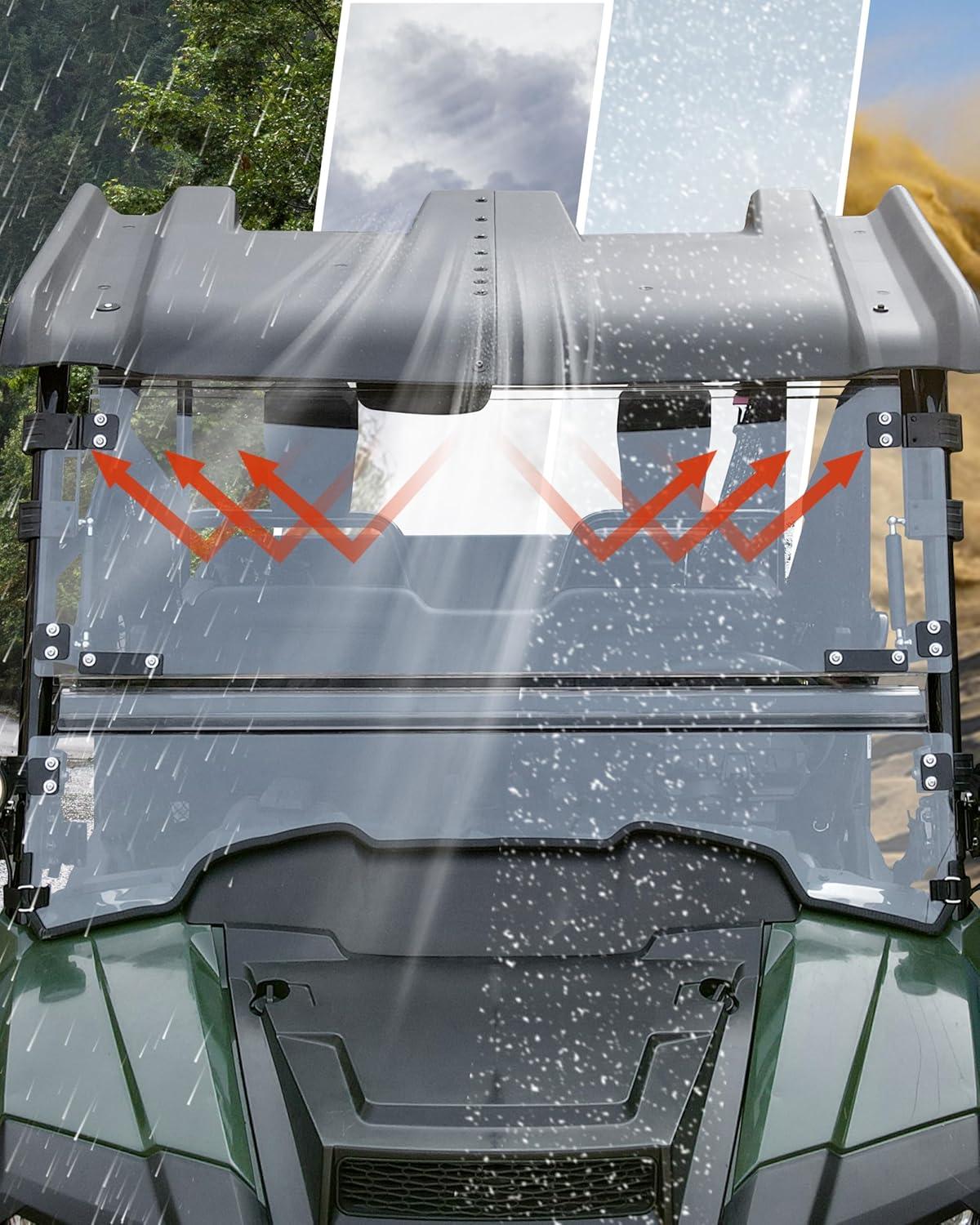 Premium Polycarbonate Panel: The windshield is made of reliable and durable 1/5″ polycarbonate panel with hard coat layer, light and strong, and offers maximum visibility and impact resistance, high light transmittance improves driving safety