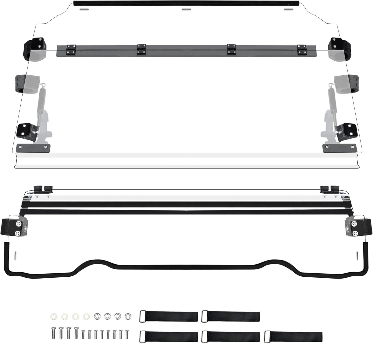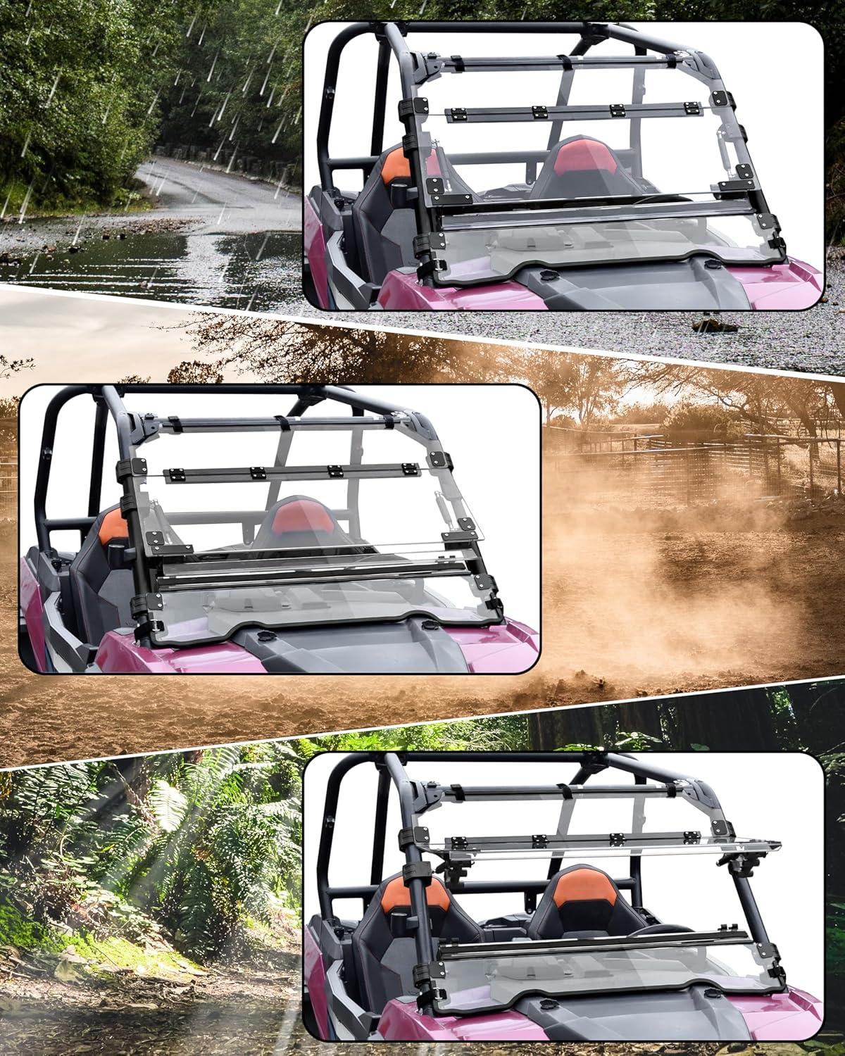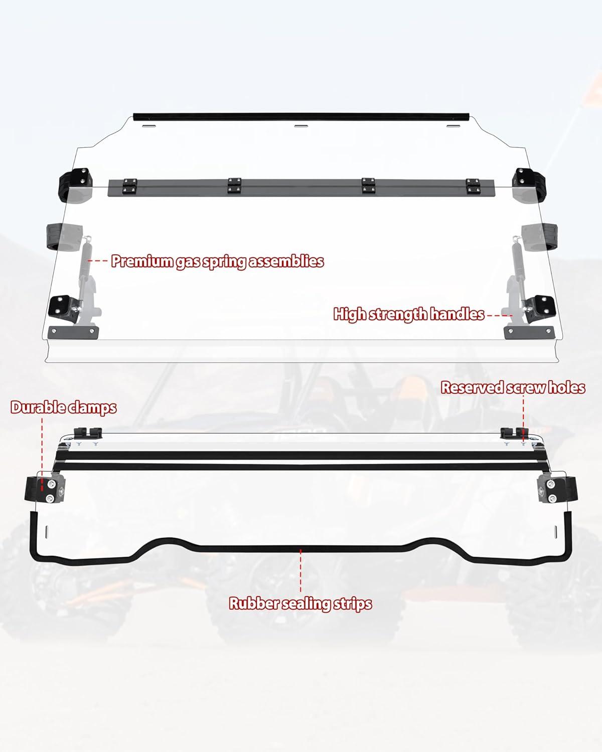 Durable Accessories: The flip-up windshield operates effortlessly via gas spring assemblies, providing sturdy support for rough terrain; Two handlebars and brackets make the windshield more stable when closed. Reinforced with durable rubber strips, it enhances friction, absorbs shocks, and minimizes damage risks to the windshield. These strips also serve noise-reduction roles, dampening disruptive vibrations and reducing harsh wind noise