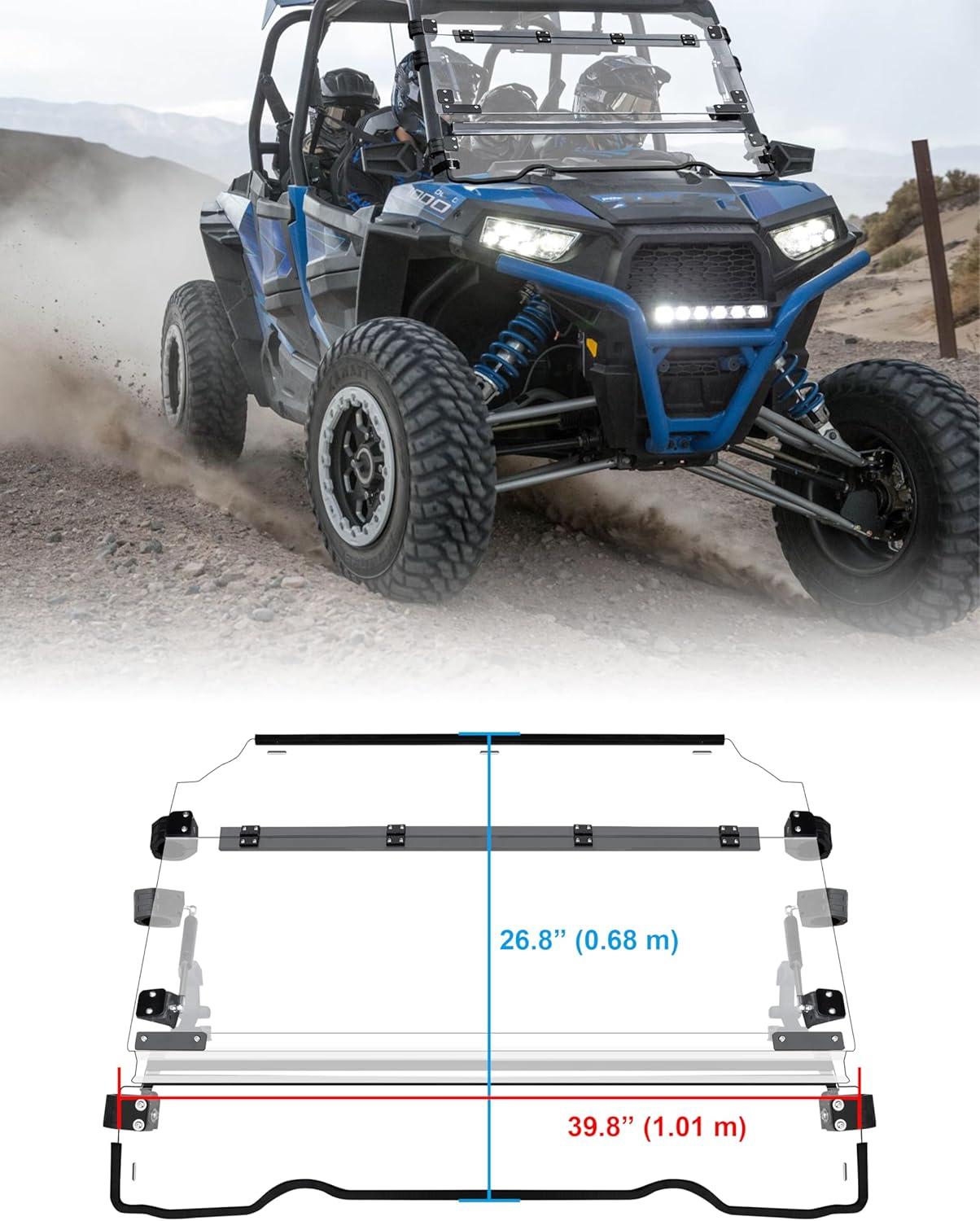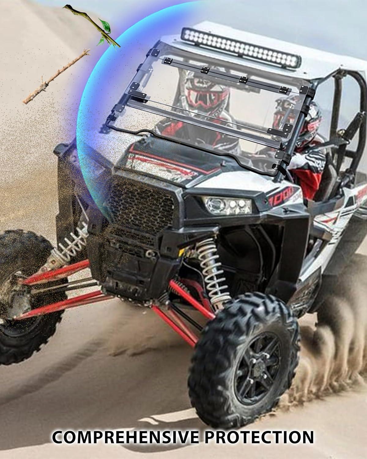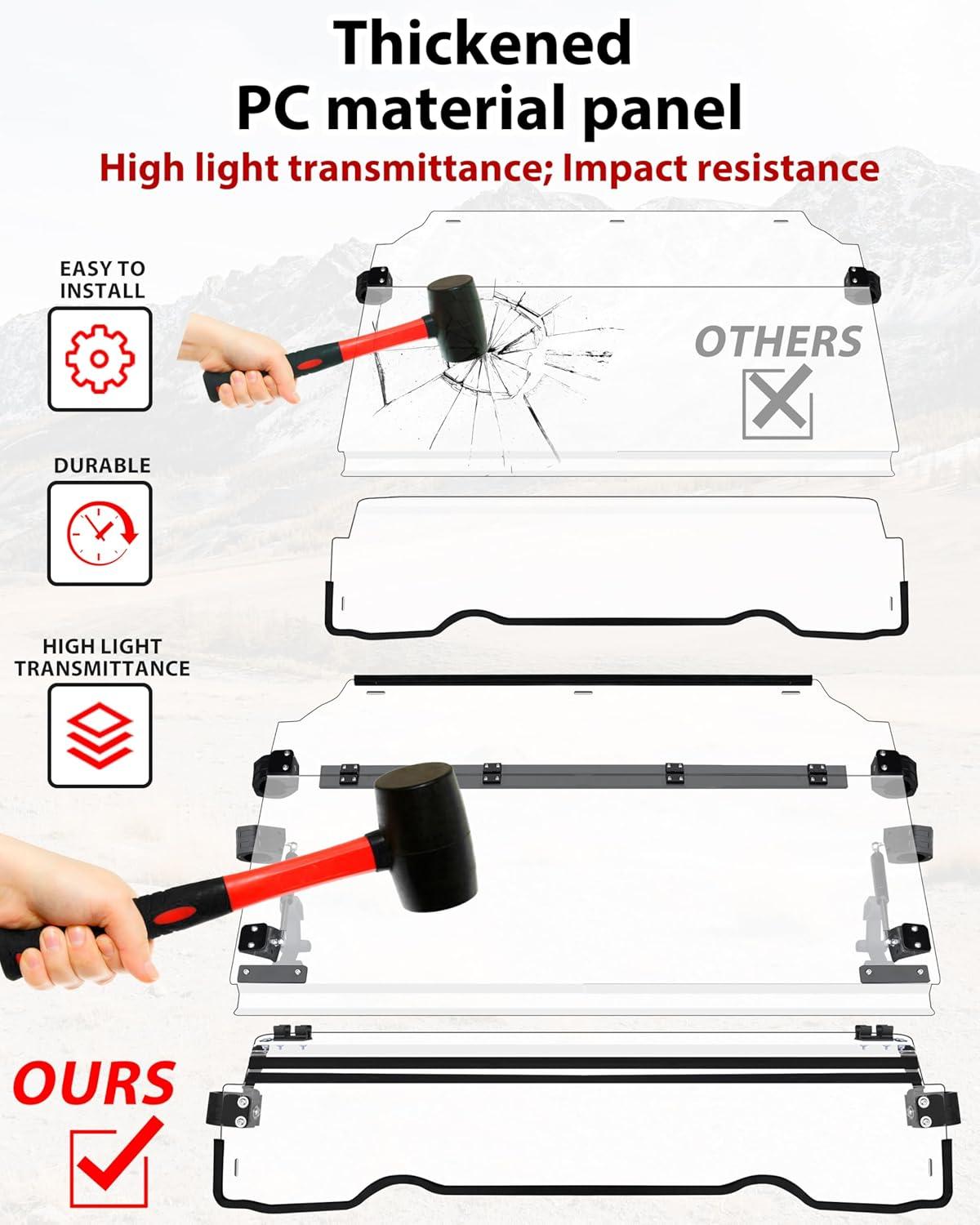 Premium Polycarbonate Panel: The windshield is made of reliable and durable 1/5″ polycarbonate panel with hard coat layer, light and strong, and offers maximum visibility and impact resistance, high light transmittance improves driving safety