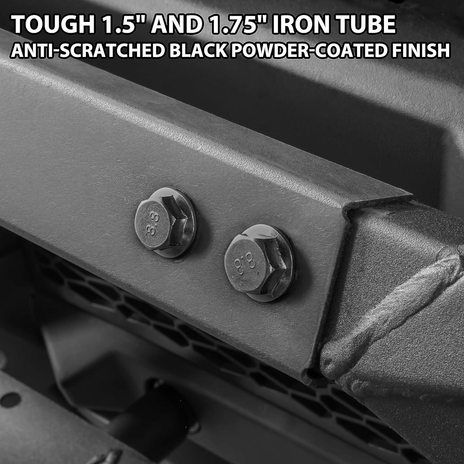 Made of high quality 1.5″ and 1.75″ iron tube, scratch-resistant and black powder-coated finish complements the tough look of your vehicle