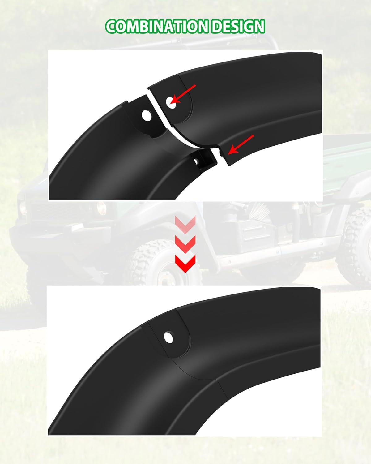 Package Include: 6PCS front fender flares kit with mount hardware, installation instructions; Quick Installation; Please refer to the installation video in the listing page before your installation