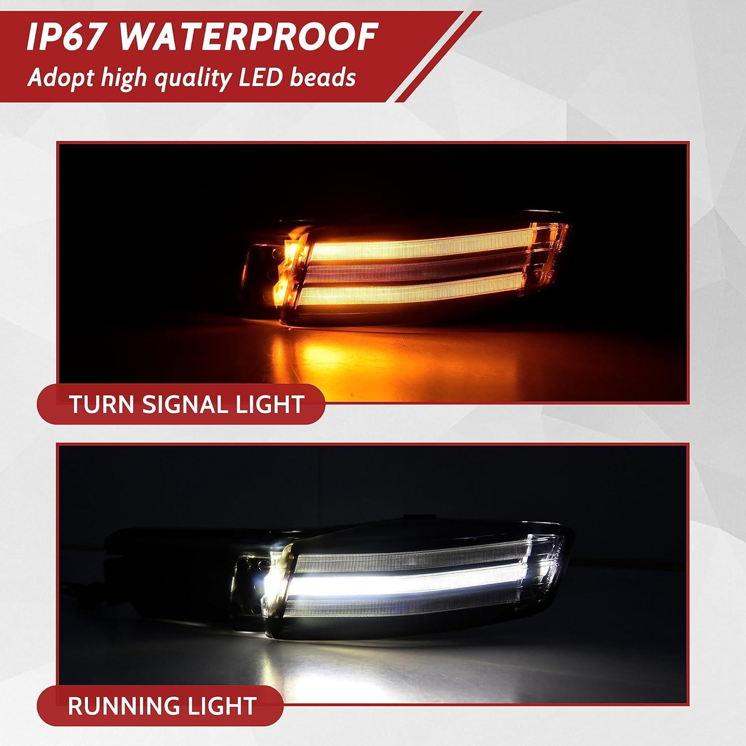 Dual fuction: Daytime running light and sequential flashing turn signal light, with high quality LED, ultra-efficient and high intensity, brighter than halogen light and energy-saving, fast heat dissipation, working in all the weather conditions