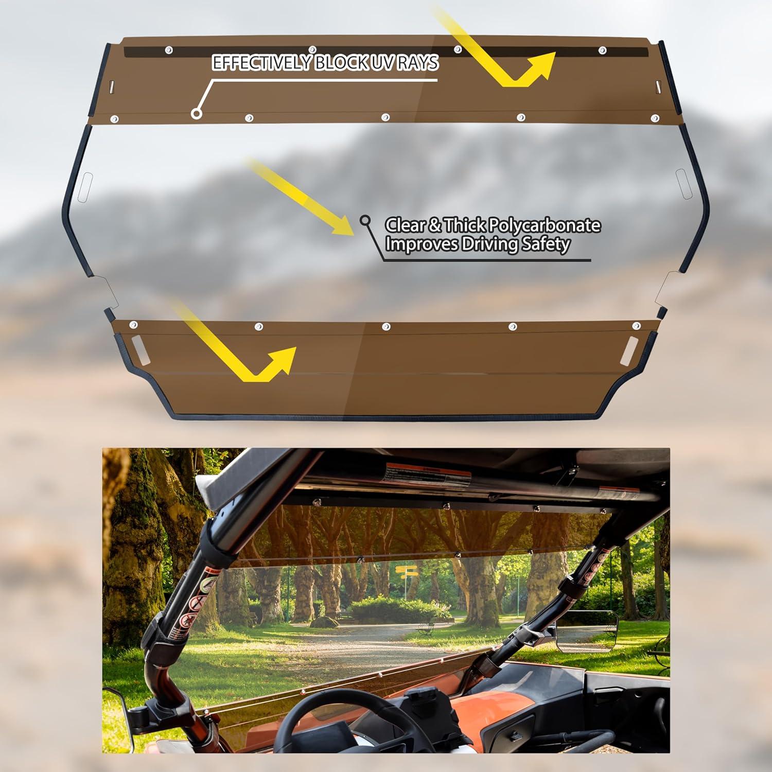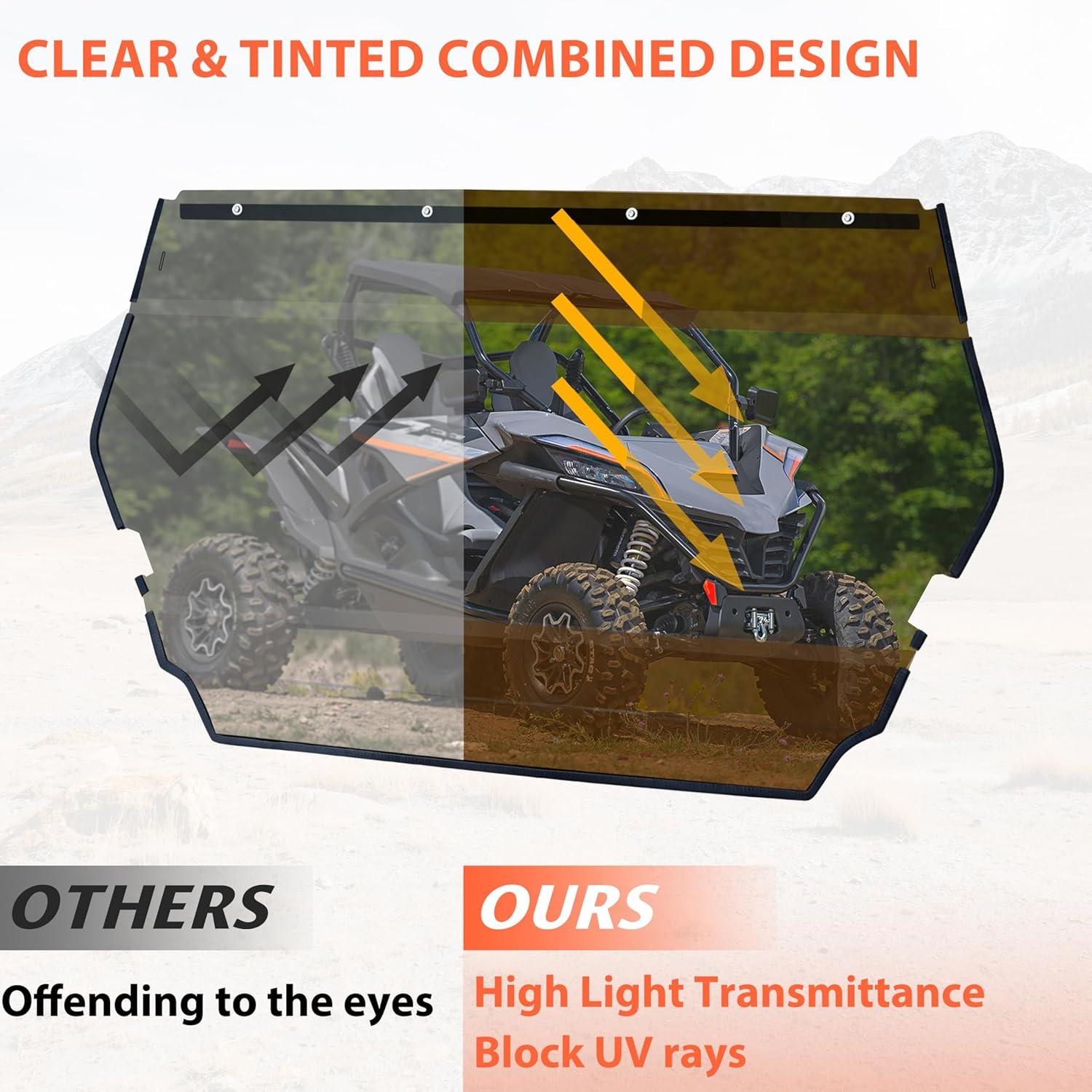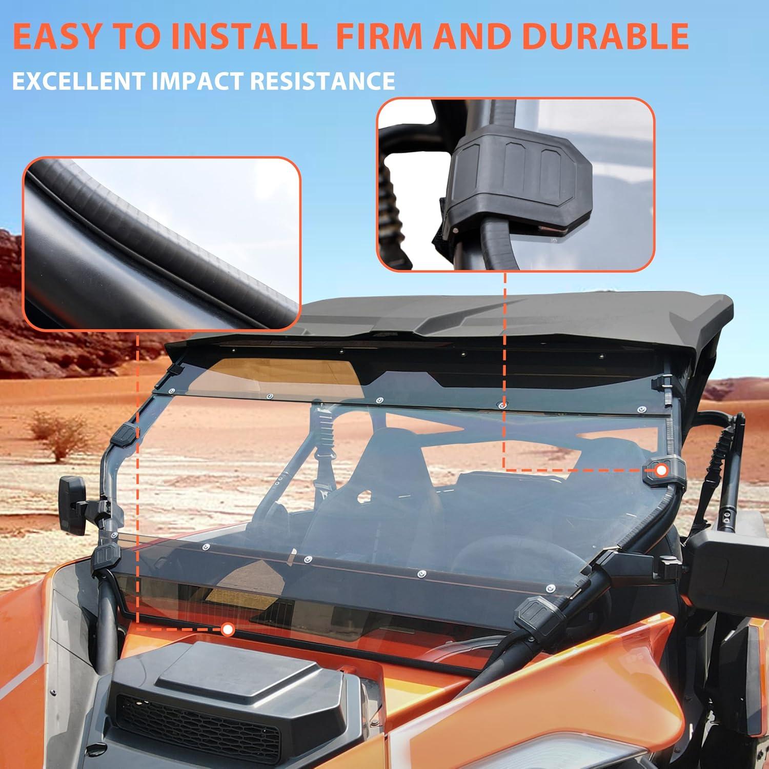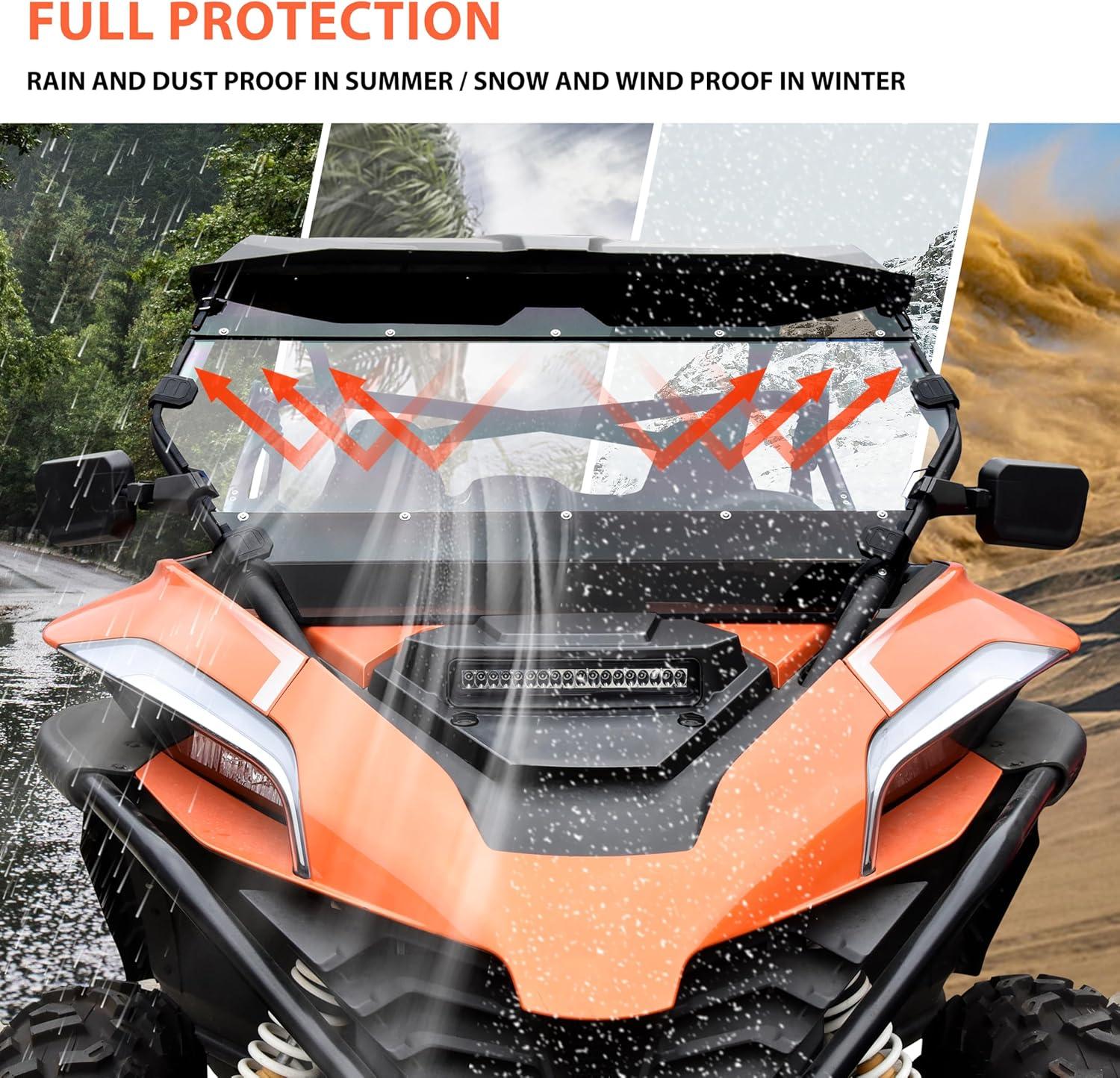 CLEAR VIEW: The front windshield is made of high-density 1/5″ polycarbonate panel, light and strong, which offer maximum visibility and impact resistance; High light transmittance improves driving safety; Hard coated layer has good protection, reliable and durable