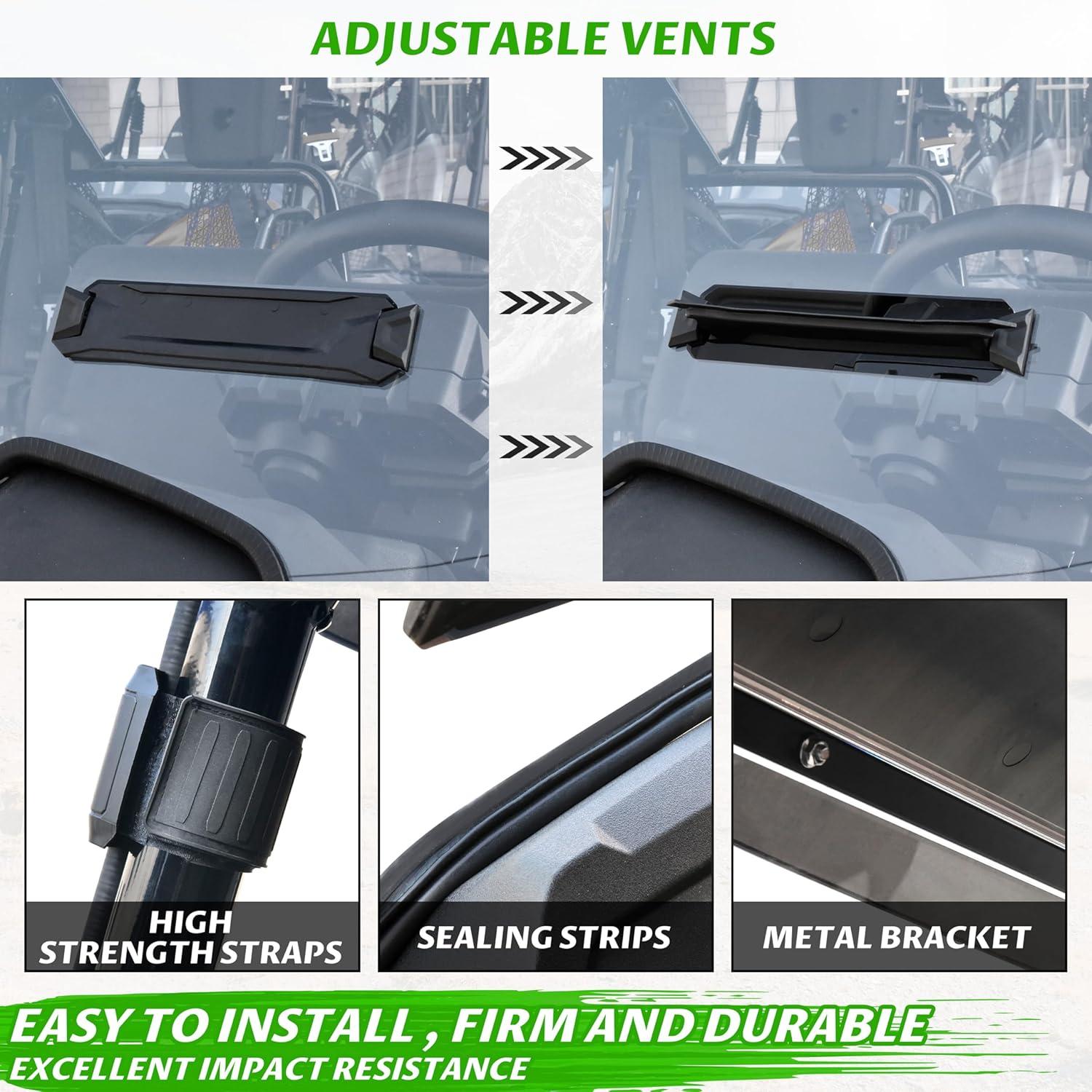 The front wind deflector provides full protection. Seals can block the elements such as dust swirl, rain and snow, keep you warm in winter, and prevent dust and rain from in summer. Two adjustable vents increase in-cab airflow, make you comfortable when driving in any season. The metal bracket at the top makes the windshield stronger and extends its service life.