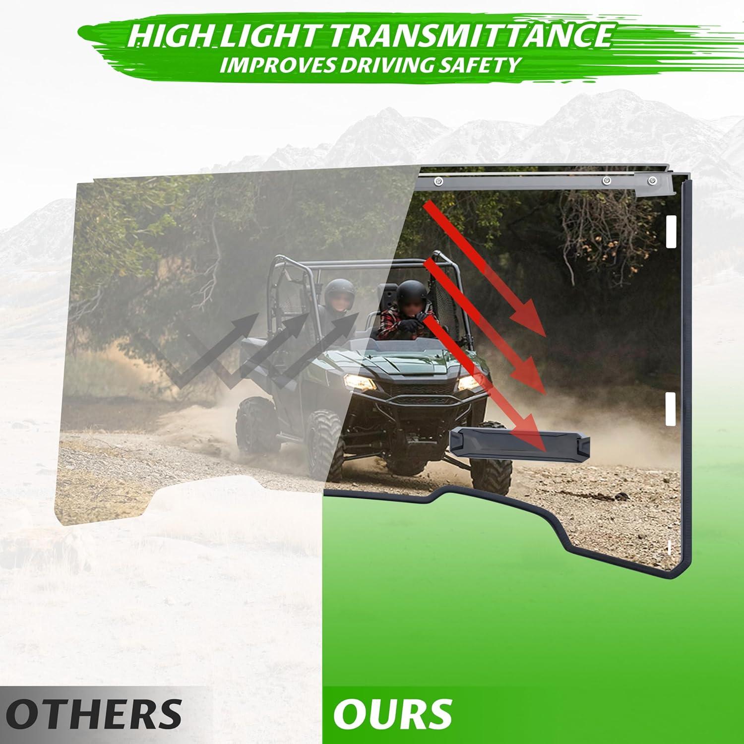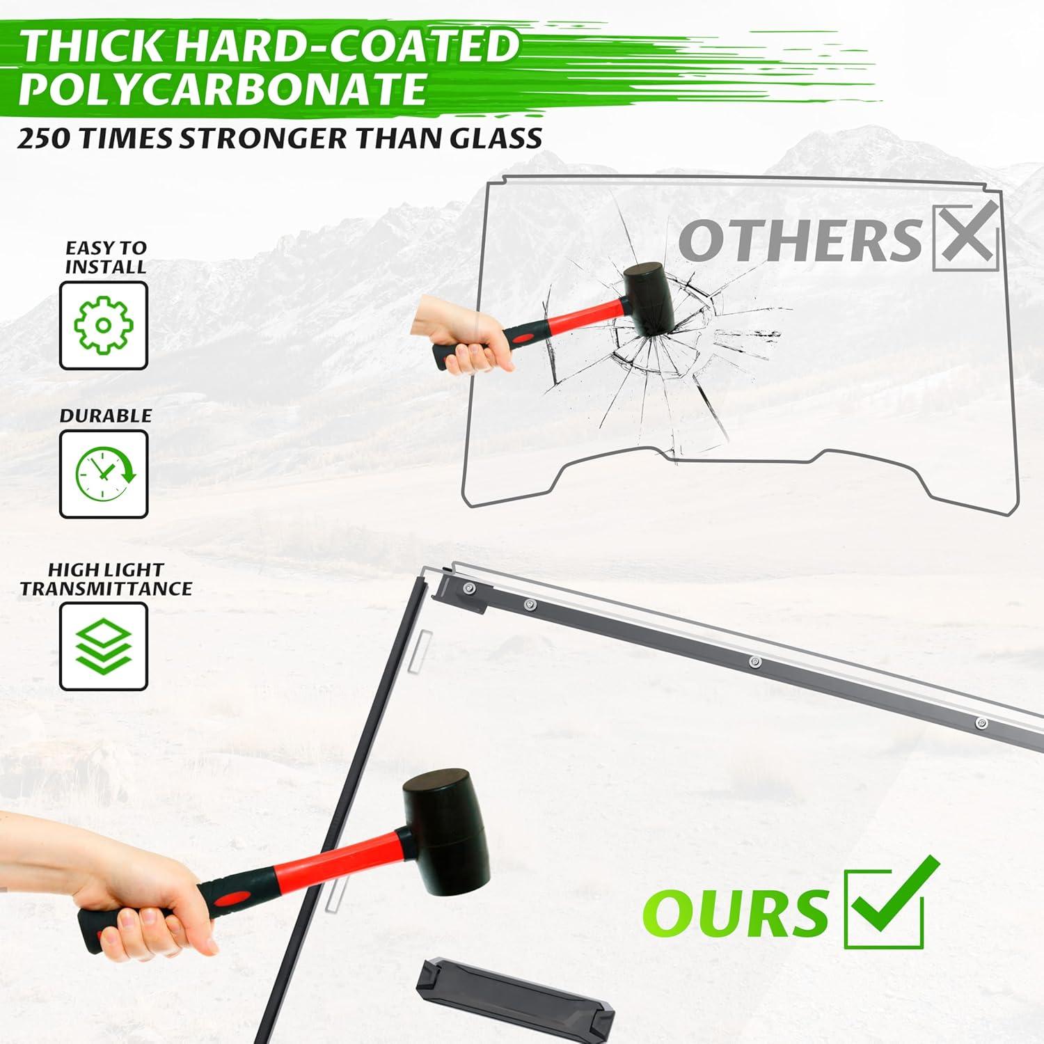 The windshield is made of high quality polycarbonate panel, light and strong, and offers maximum visibility and impact resistance, high light transmittance improves driving safety, hard coat layer with good scratch-resistance, reliable and durable.