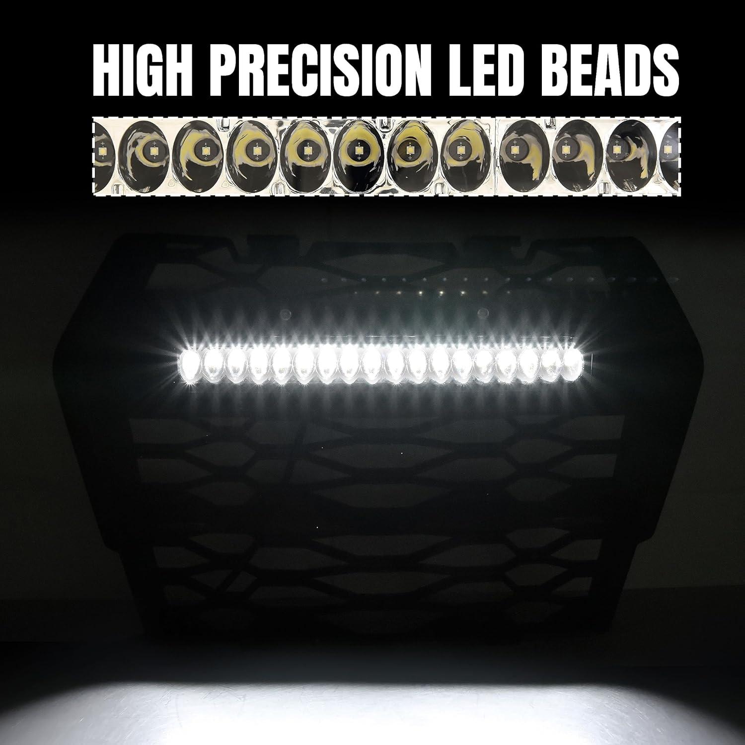 Easy to install; Plug & play; Package includes 1PC Mesh Grill with LED Light, all mount hardware and installation manual(Please refer to the installation video before your installation)