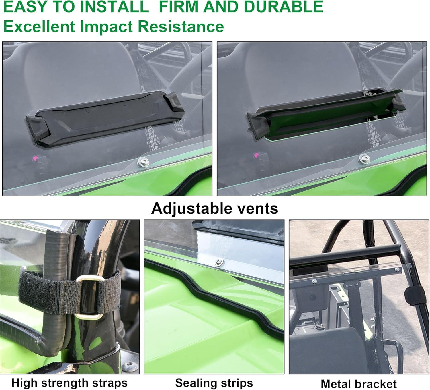 Provides full protection. Seals can block the elements such as dust swirl, rain and snow, keep you warm in winter, and prevent dust and rain from in summer. Two adjustable vents increase in-cab airflow, make you comfortable when driving in any season. The metal bracket at the top makes the windshield stronger and extends its service life