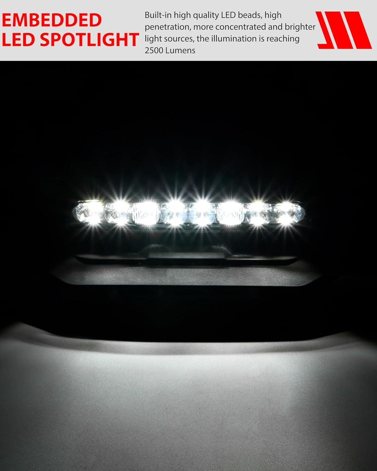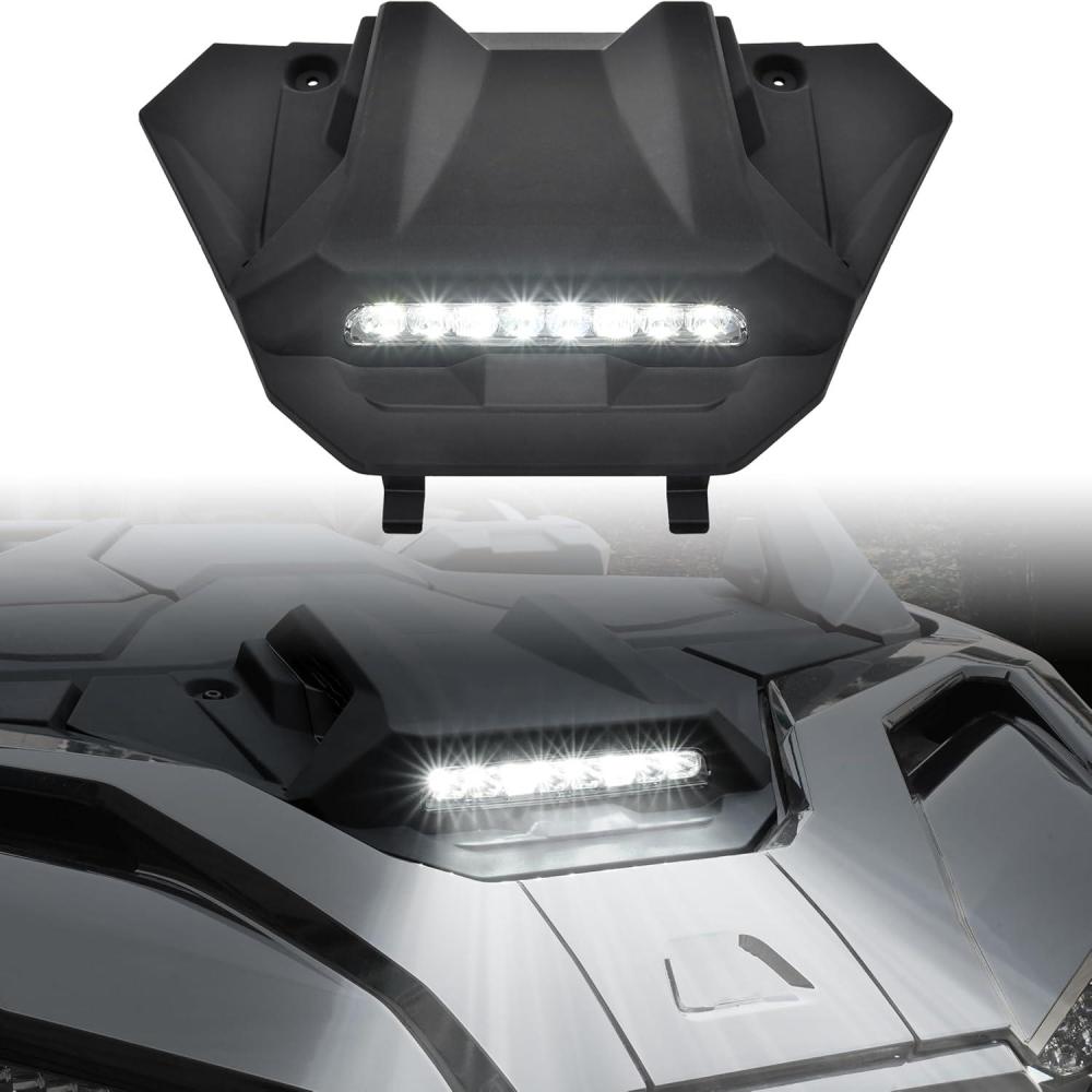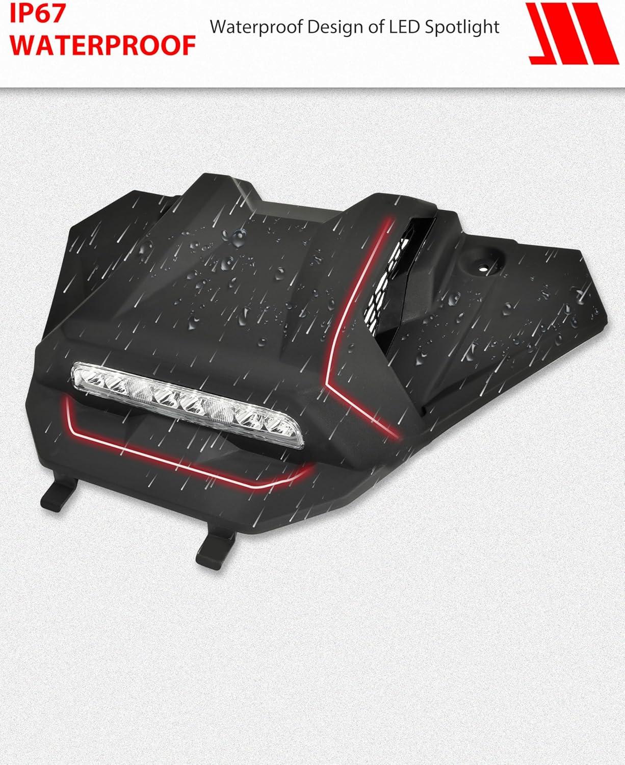 Embedded LED Spotlight: This Turbo hood kit has a embedded LED spotlight, built-in high quality LED beads, more concentrated and brighter light sources, the illumination is reaching 2500 Lumens, die-cast aluminum housing, advanced air duct design, grooved heat sink, fast heat dissipation, working in all weather conditions