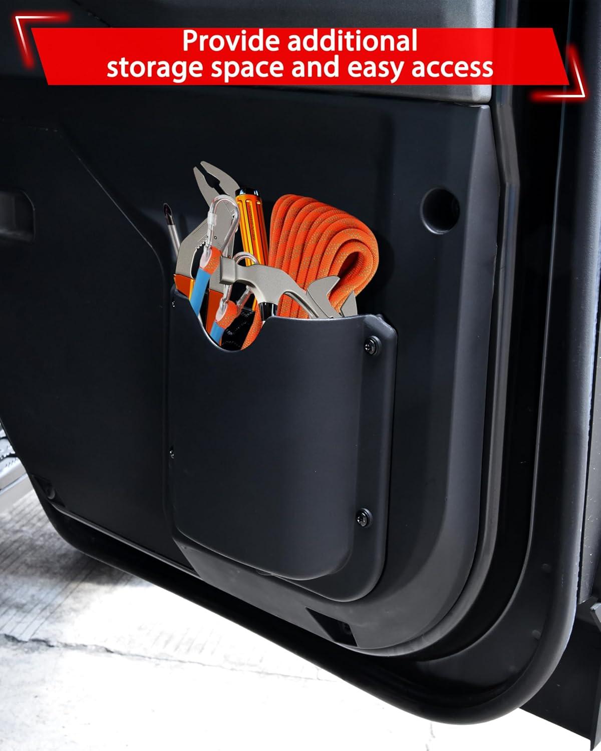 Easy Installation: Easy to install; Save time and frustration with hassle-free, bolt-on design; (Please refer to the installation video in the listing before your installation); Package include: Four Pieces (front and rear) of Door Pockets with mount hardware and installation instuction