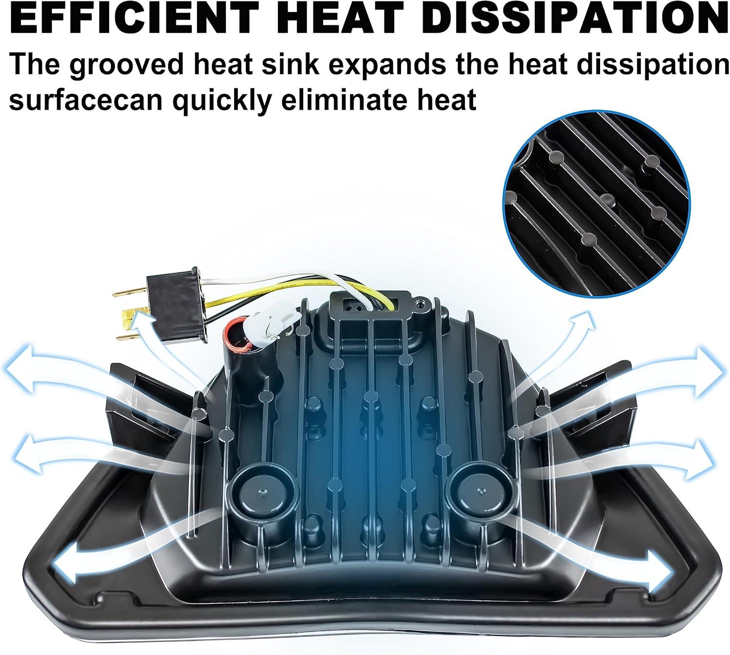 Streamline appearance design, consists of 2 line shape DRL, 1 spherical lens high beams and 3 semicircle lens low beams; Die-cast aluminum housing, advanced air duct design, grooved heat sink, cooling holes make heat dissipation much faster