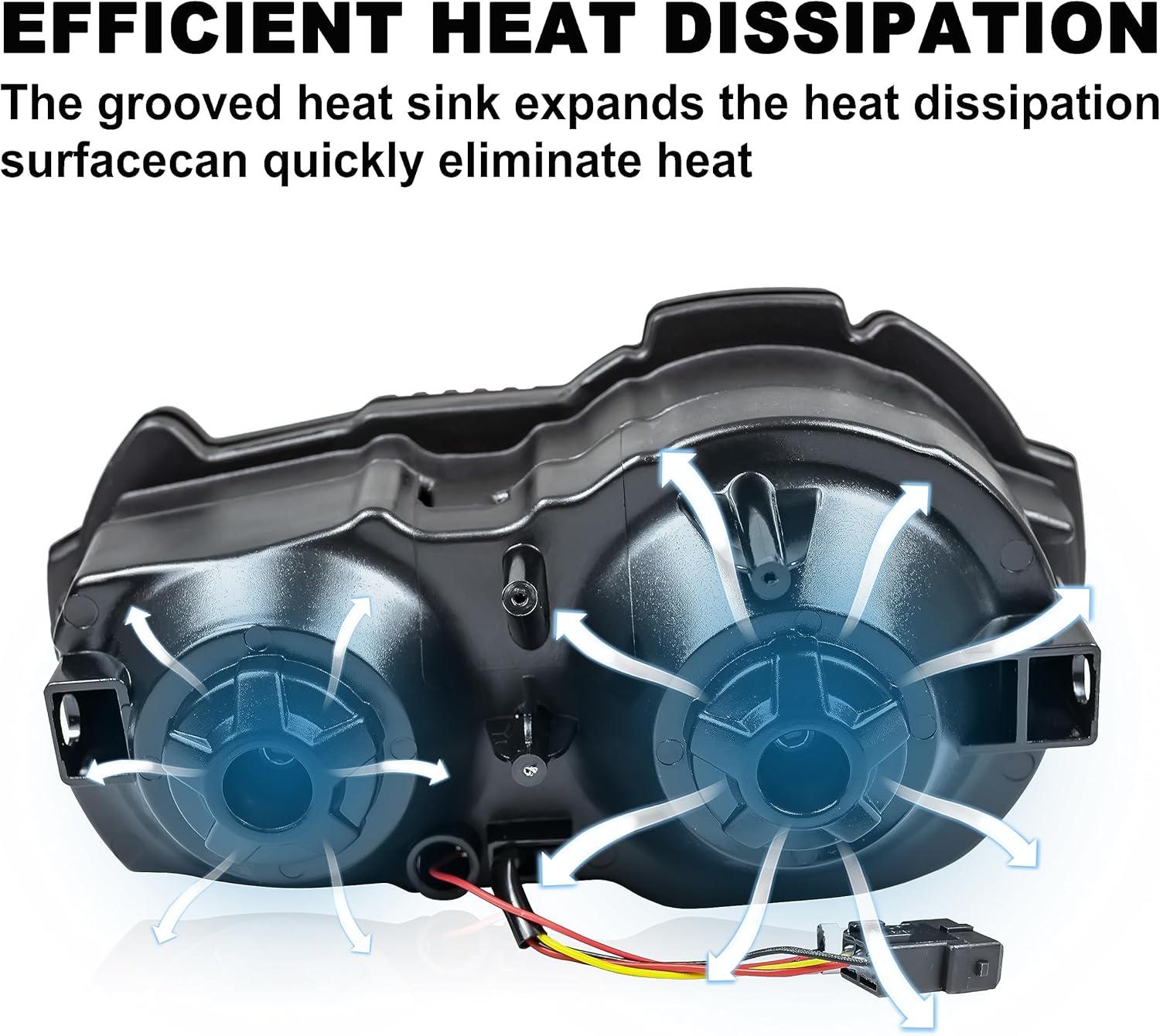 Streamline appearance design, consists of a halo ring DRL, 2 spherical lens high beams and 4 semicircle lens low beams; Die-cast aluminum housing, advanced air duct design, grooved heat sink, cooling holes make heat dissipation much faster