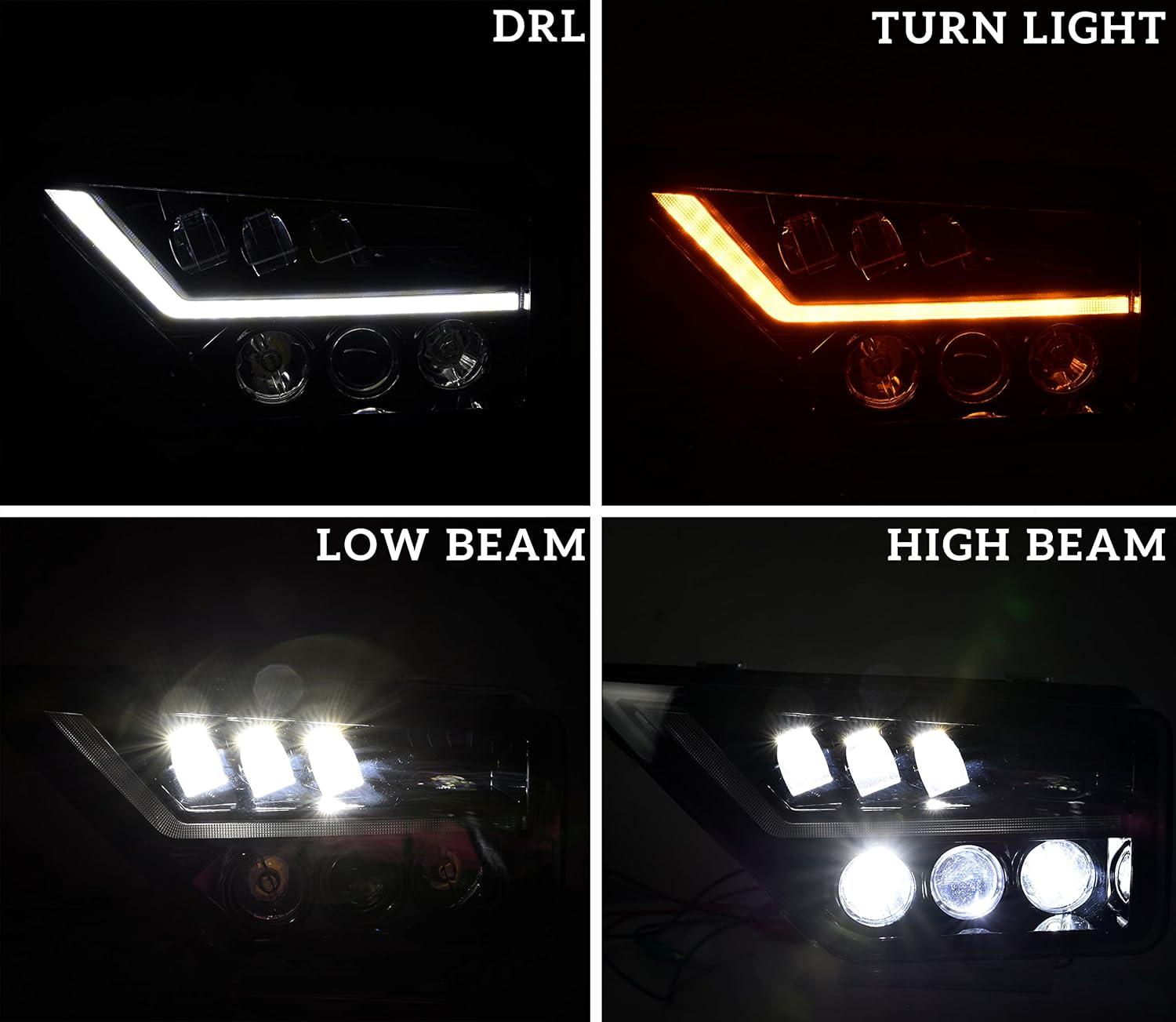 Full LED design, combines the daytime running lights, turn signal lights, high beams and low beams; High quality LED beads were used, energy saving, high penetration, more concentrated and brighter light sources, ensure driving safety