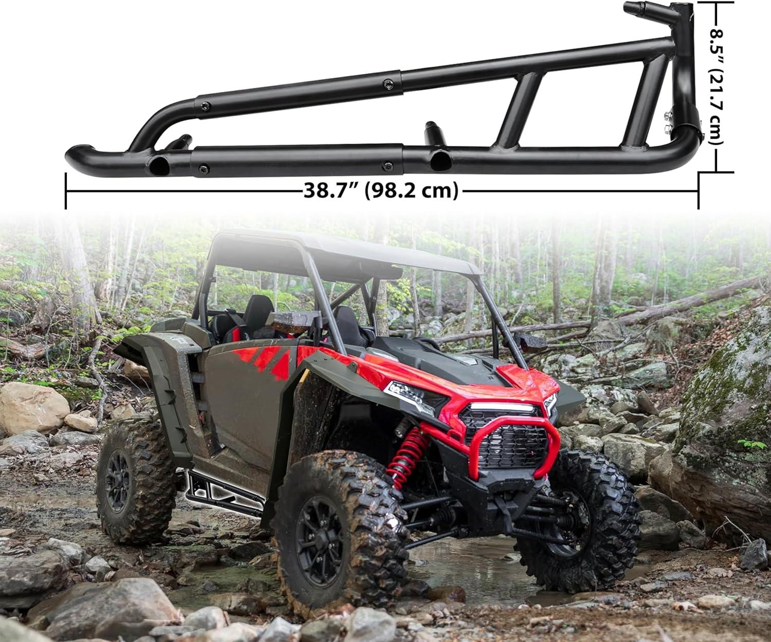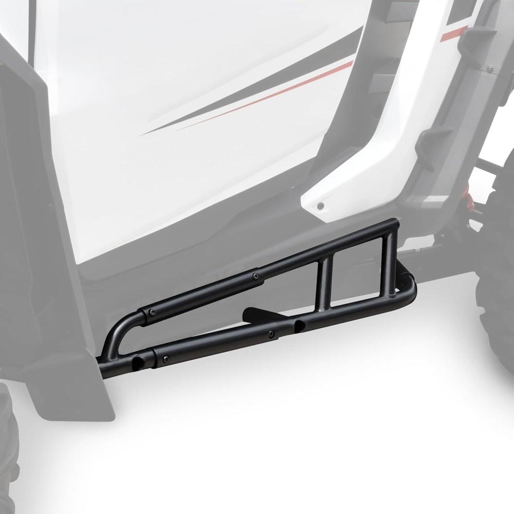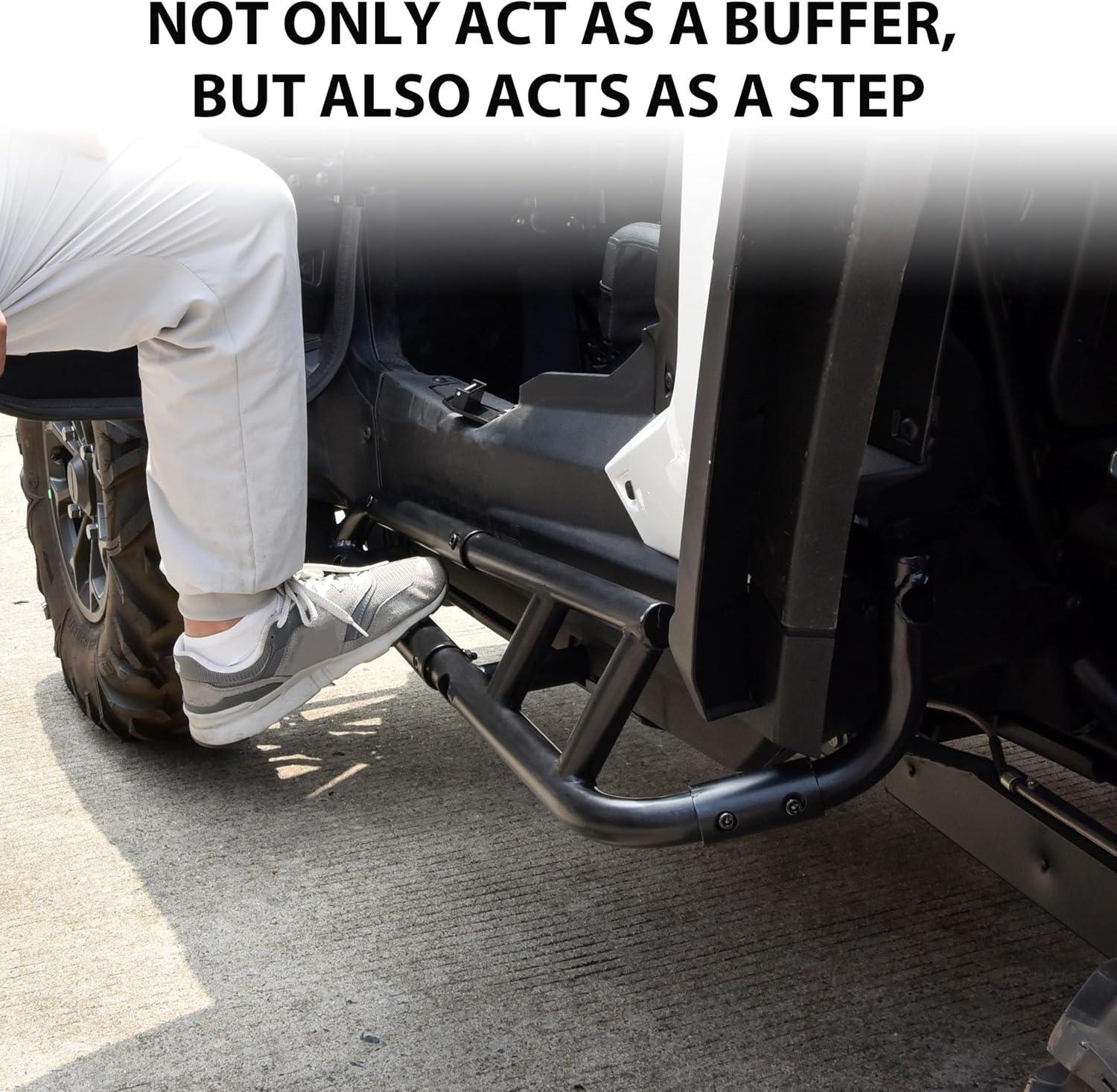 It not only acts as a buffer to protect the side wheels and rear wheels from unforeseen objects on the trail or on the job site, but also serve as a step to help get in and out of the vehicle