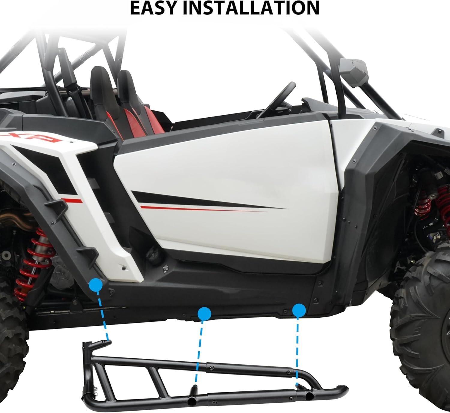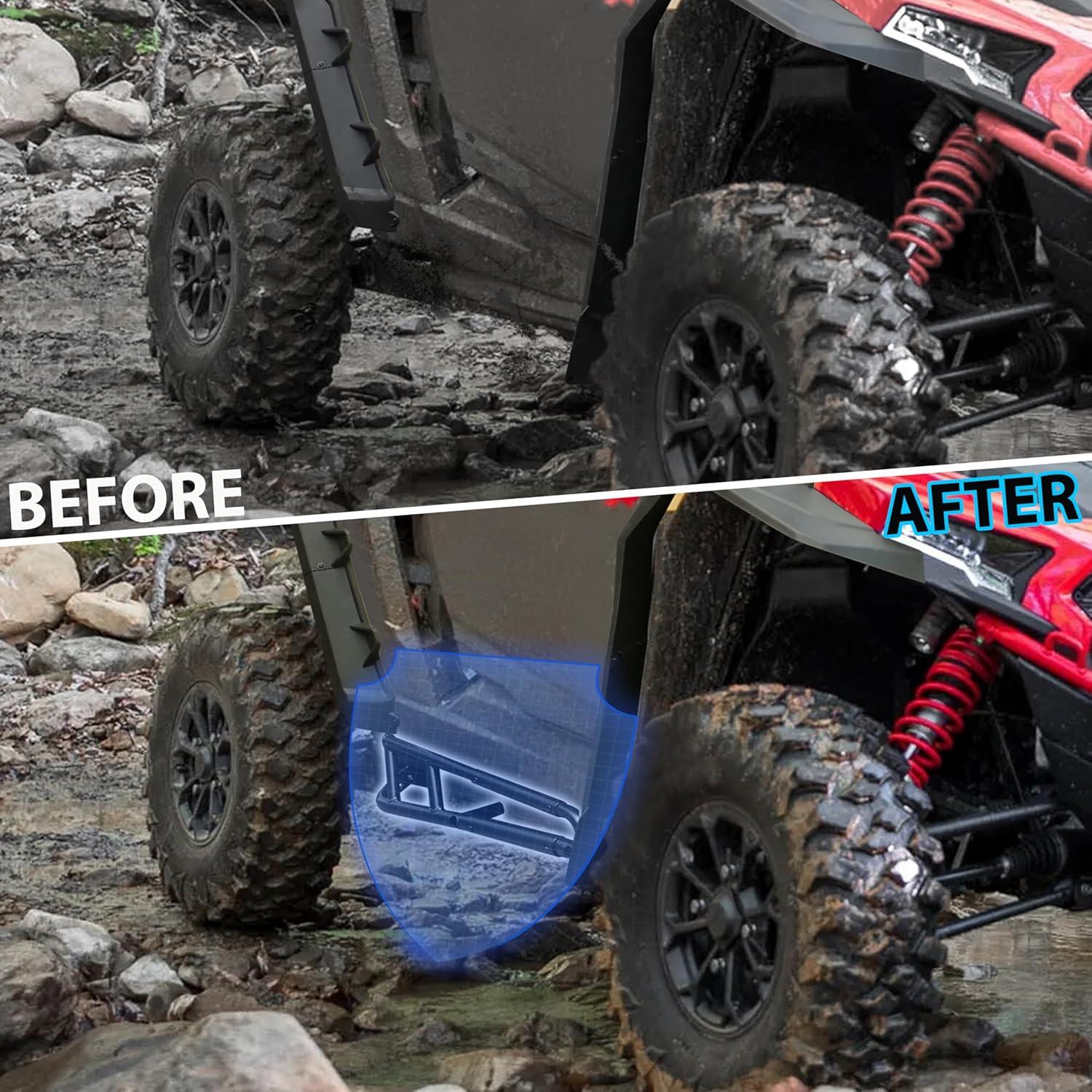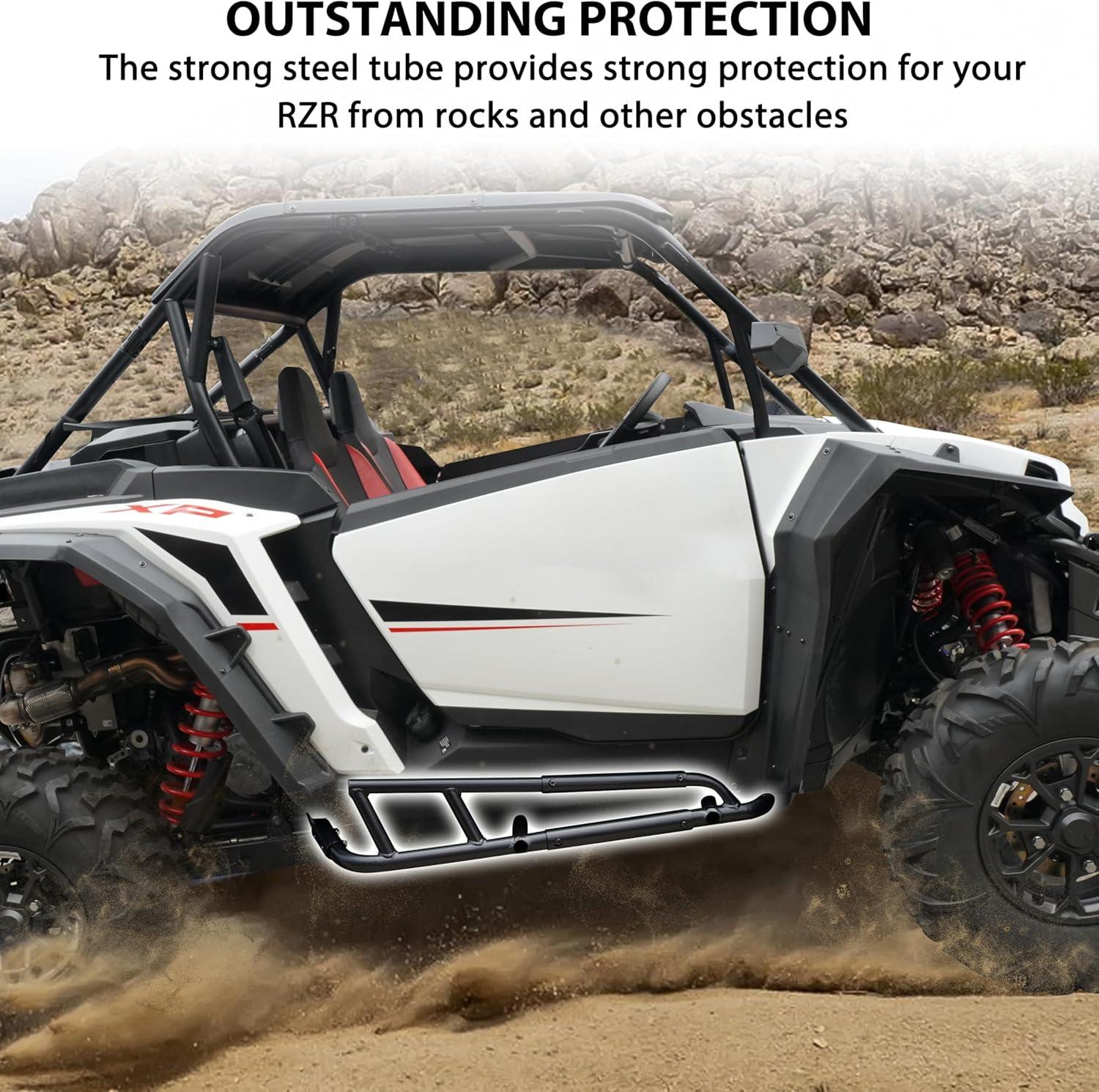 It not only acts as a buffer to protect the side wheels and rear wheels from unforeseen objects on the trail or on the job site, but also serve as a step to help get in and out of the vehicle
