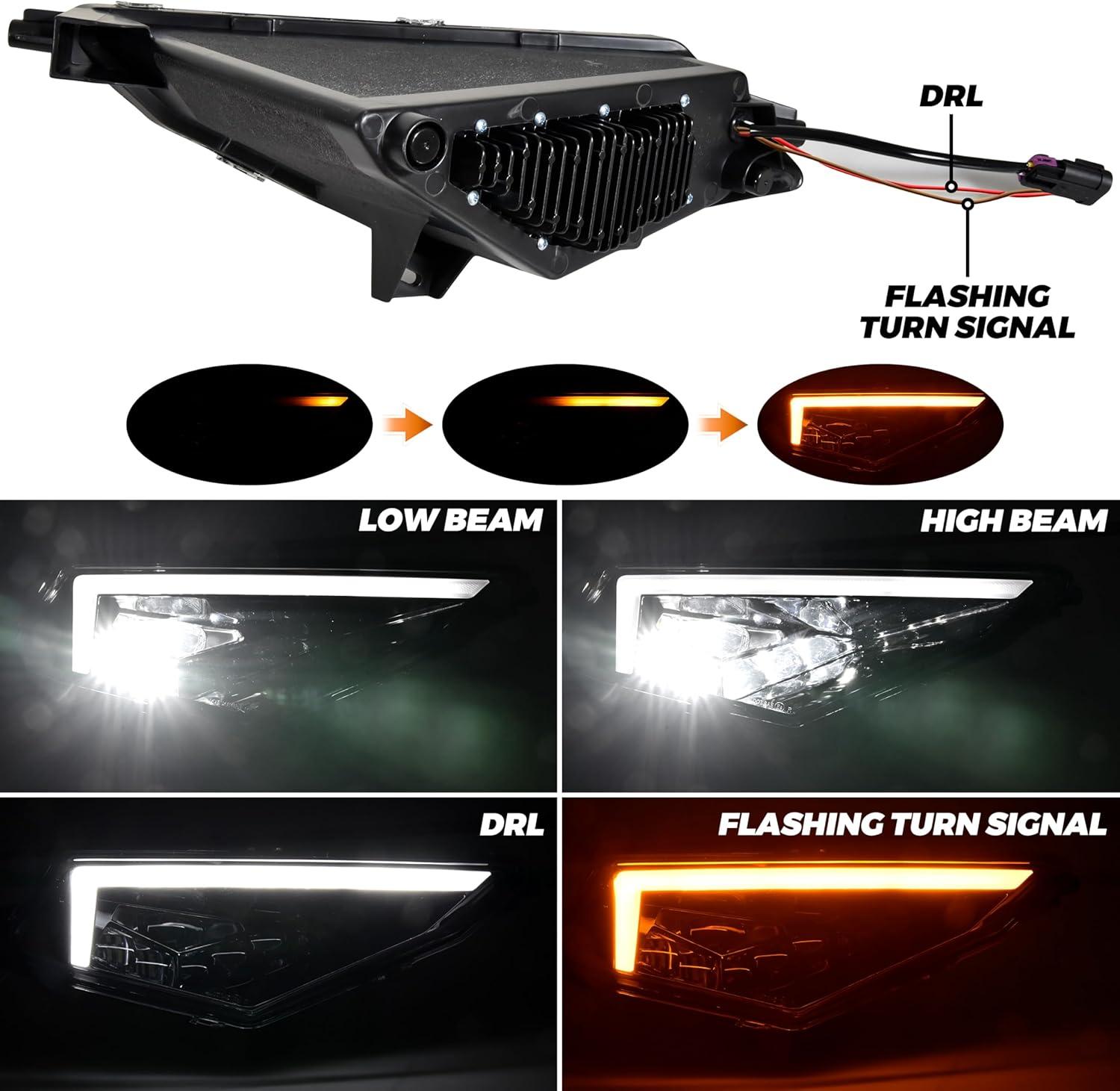 Full LED design – Daytime Running Lights (Halo Rings) + Turn Signals + Low Beam + High Beam, high quality LED beads are used, brighter than halogen lights and energy saving, reaching 3600 Lumens; The head lamp has high penetration, more concentrated and brighter light sources, and ensures driving safety