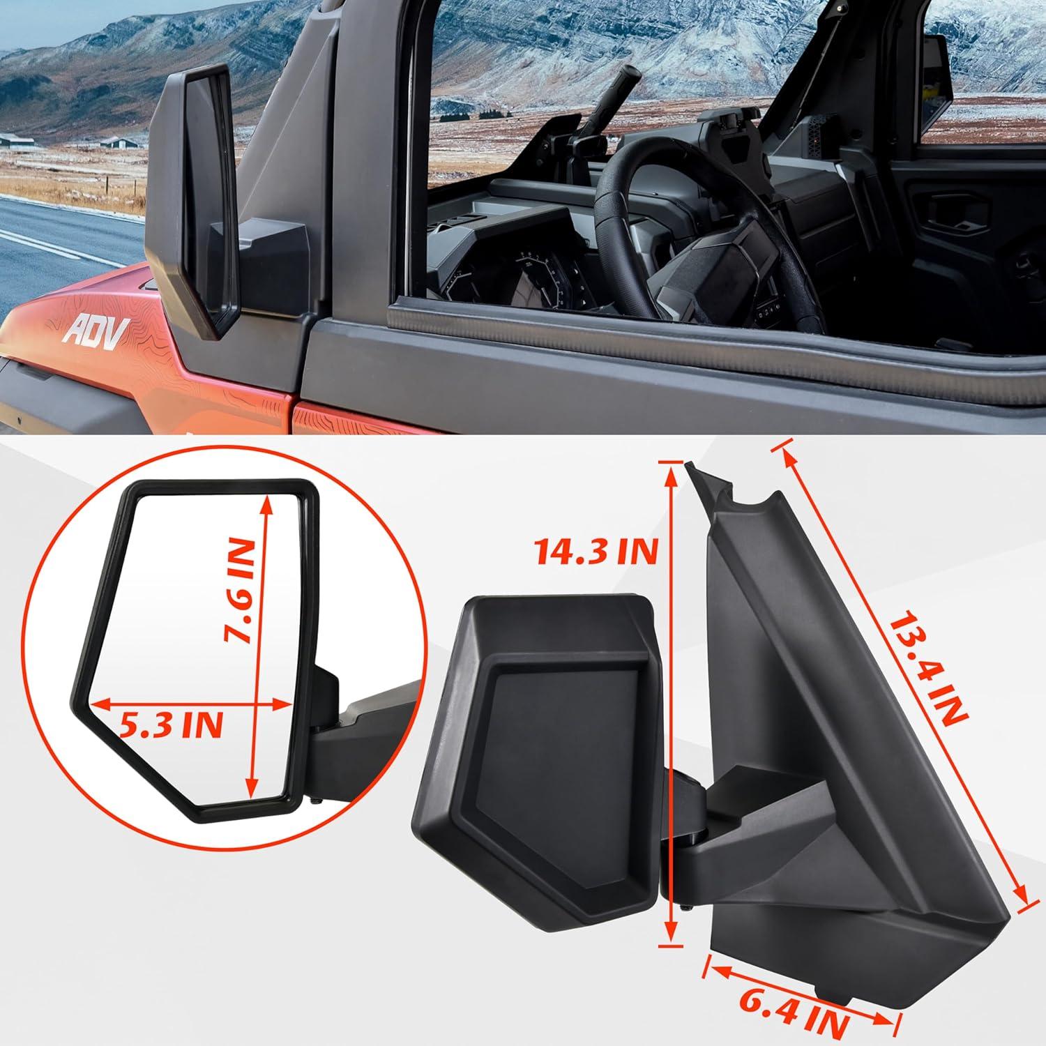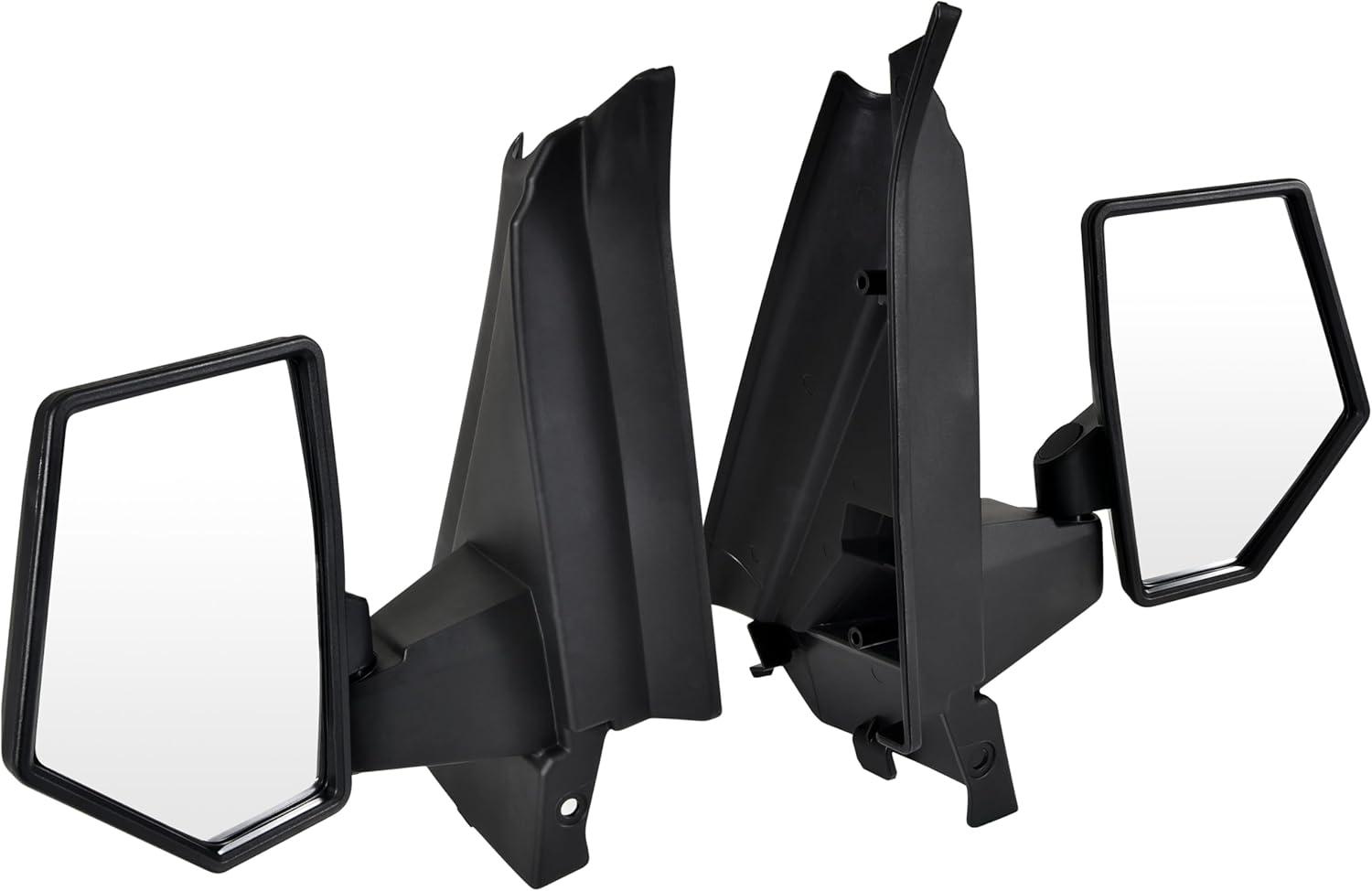 Side mirrors with guard plates, mounts on A-Pillar of any vehicle with or without doors; matte black finish, matches the overall style of your vehicle; Package Include: 1 pair of folding side mirrors with all the mount hardware, installation instructions