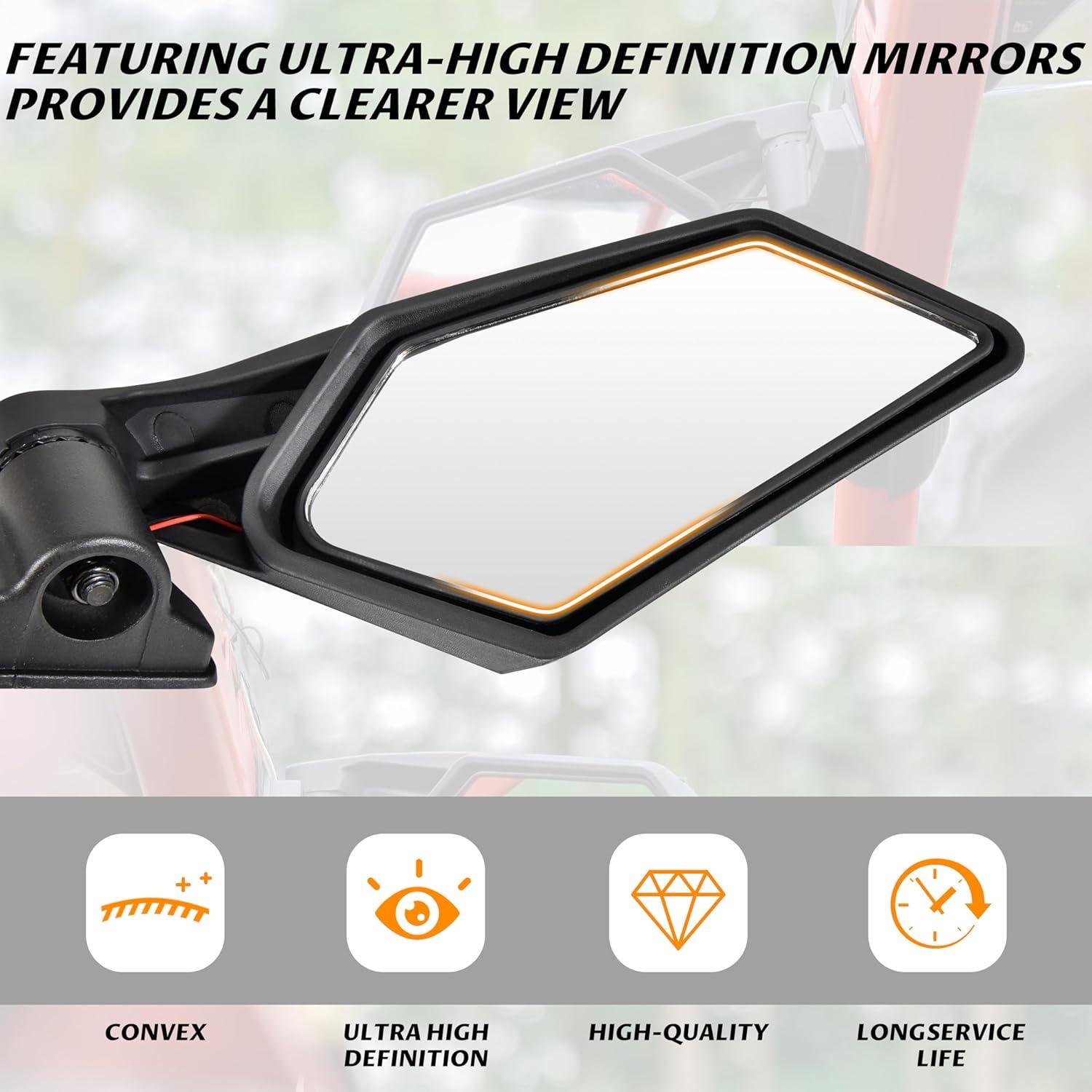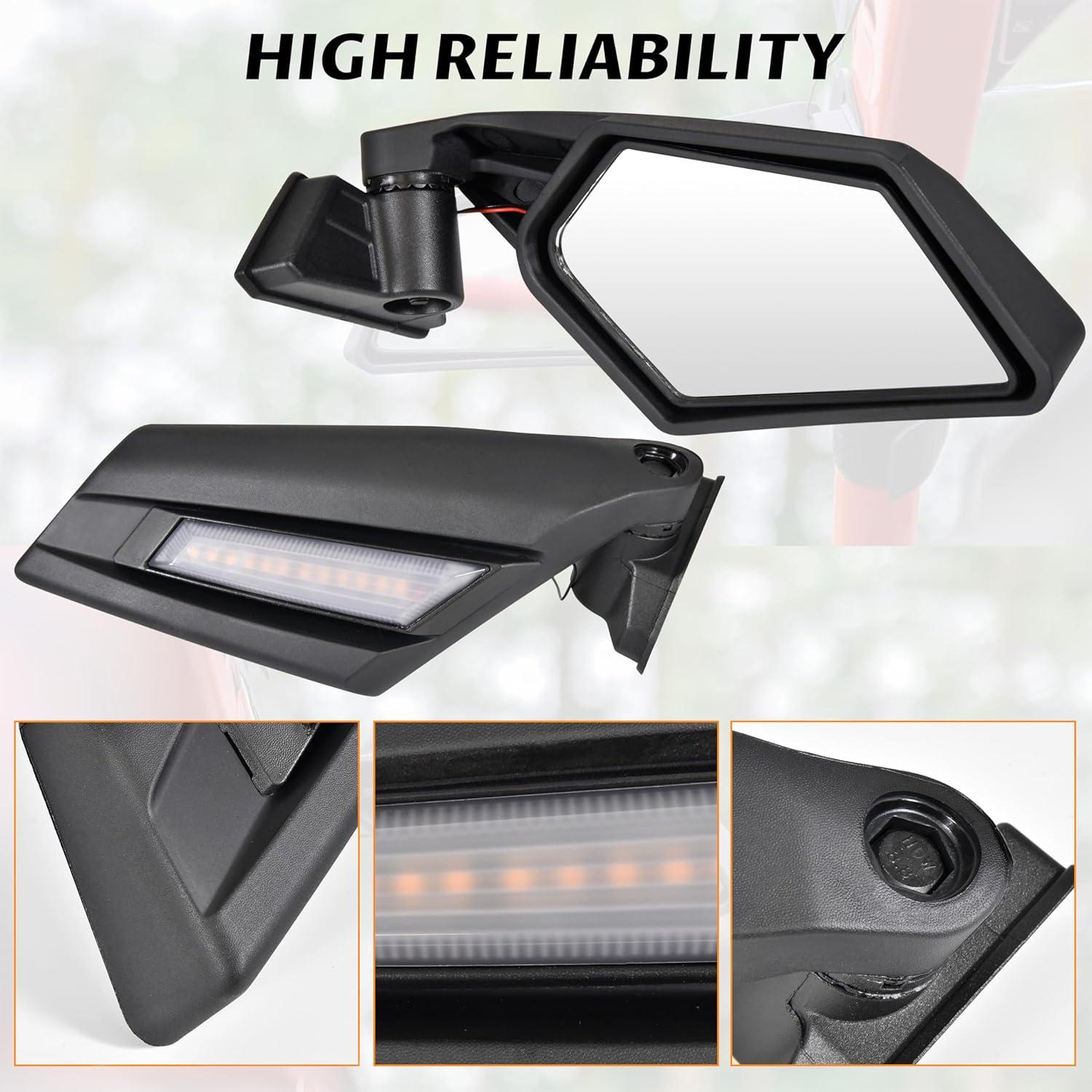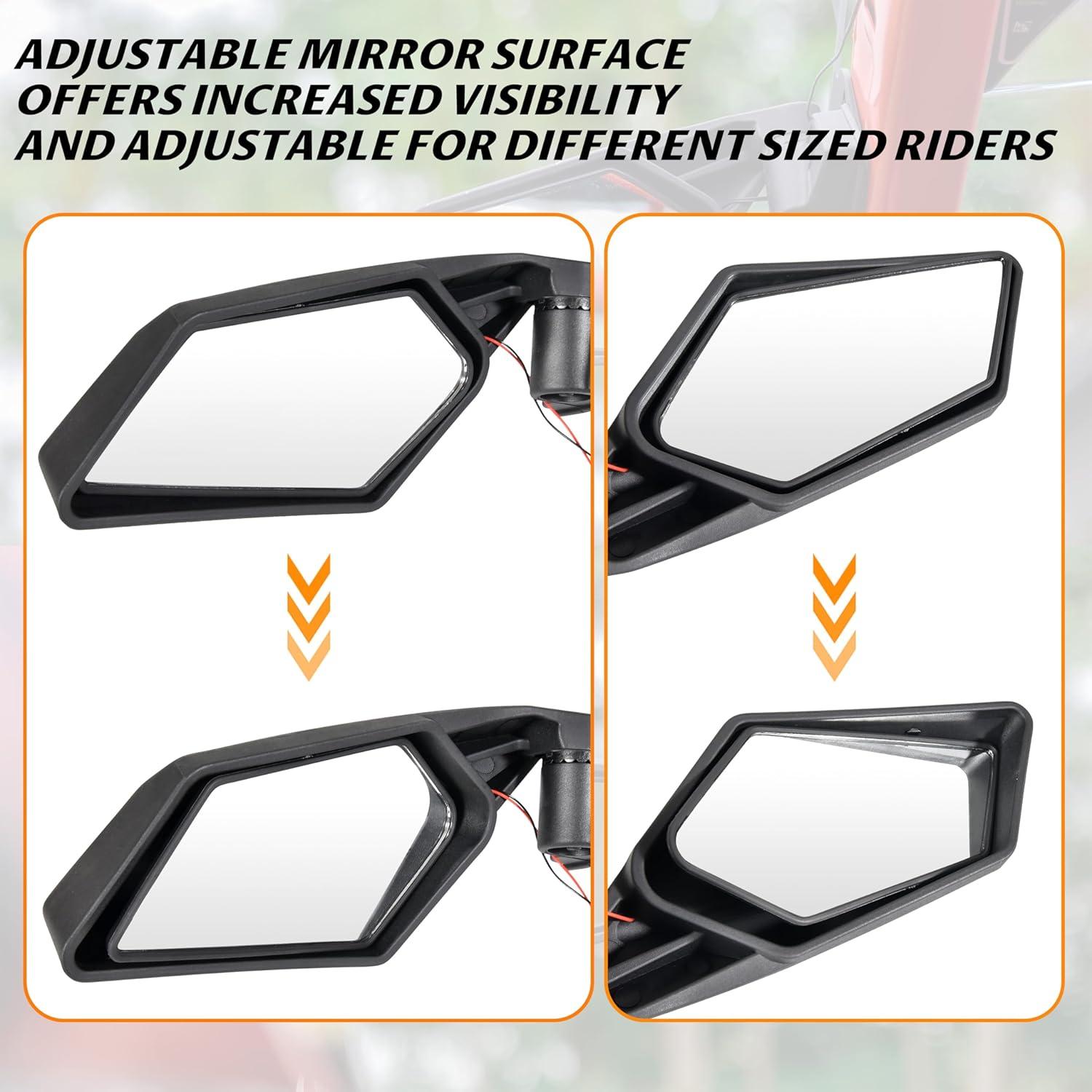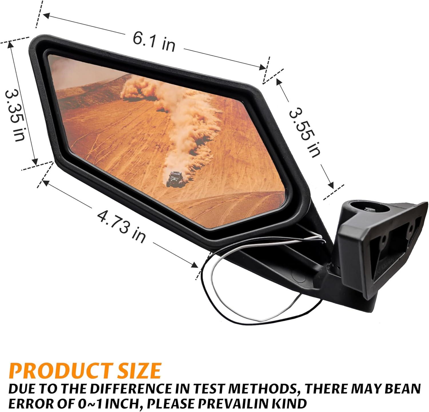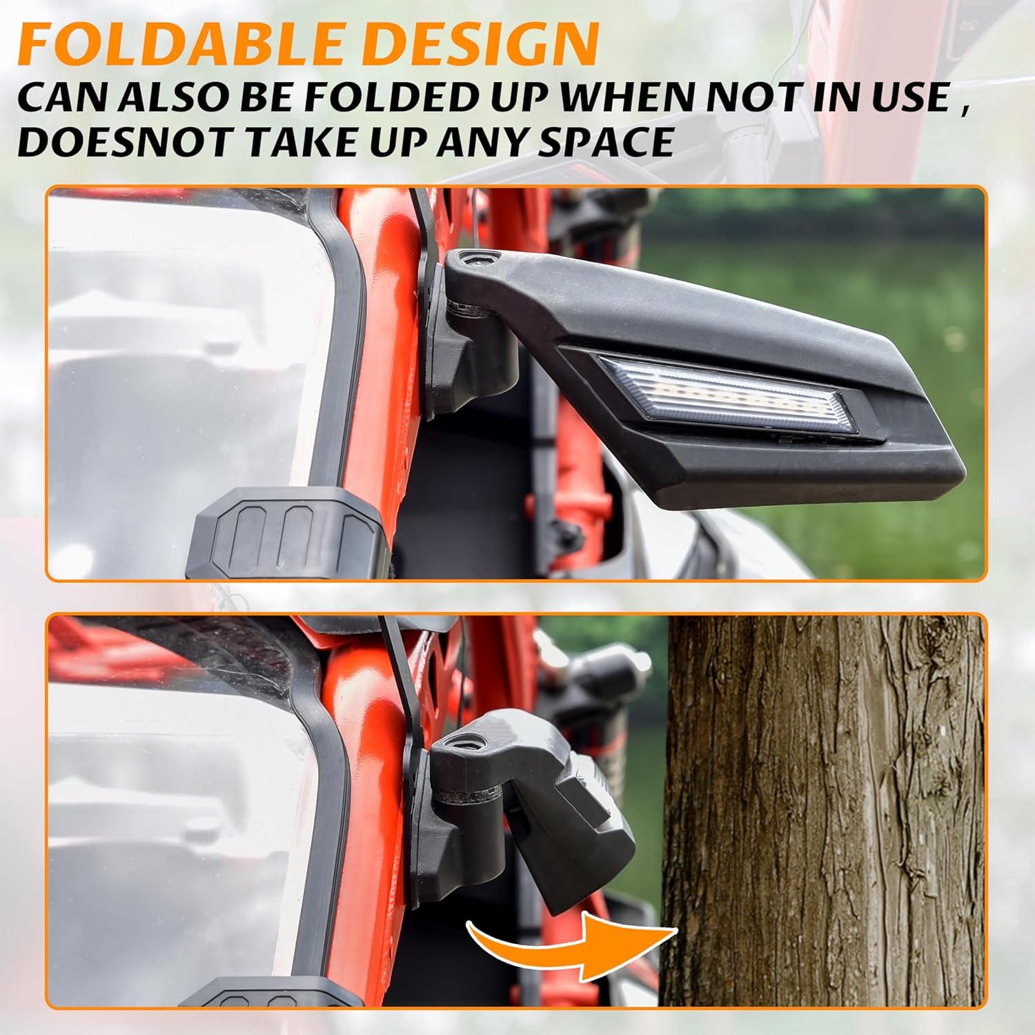 Made of high quality mirrors with coated cast-aluminum mounts, can work in all weather conditions; Matte black finish, matches the style of your vehicle; With the spring-loaded pivots, it can be folded back completely and resist damage in tight situations