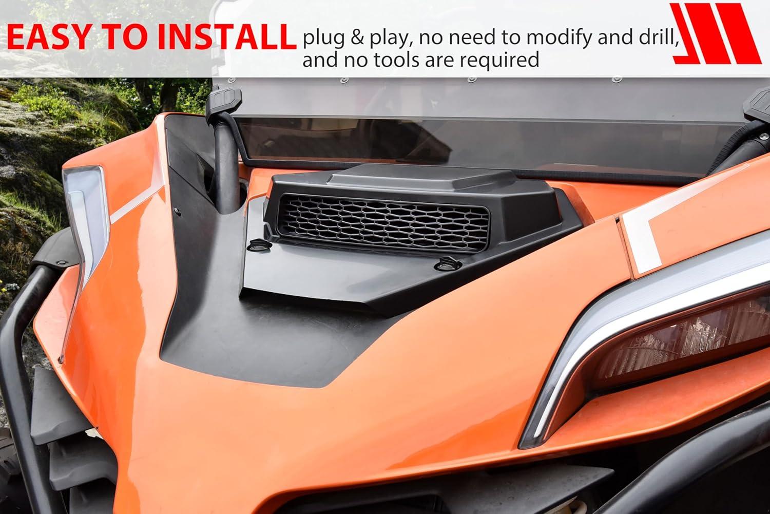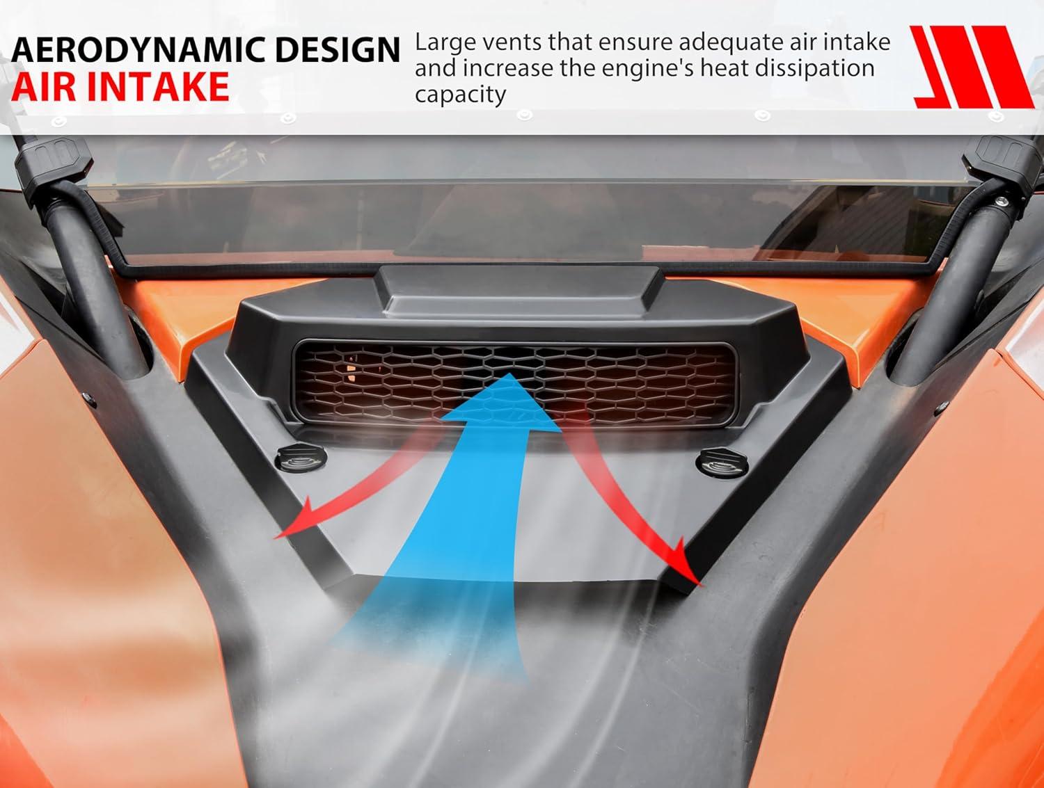 Good heat dissipation: This Turbo hood scoop kit has large removable vents that increase the engine's heat dissipation capacity which help extend the life of the engines. The lightweight hood kit will not slow down your UTV's driving speed.