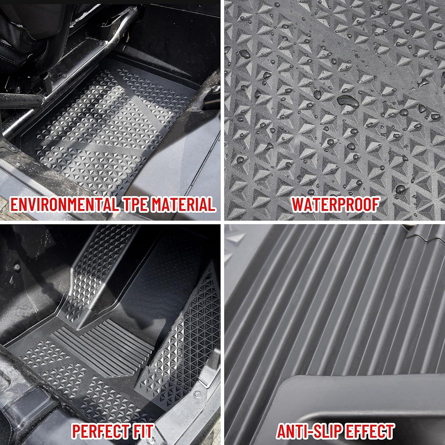 HIGH QUALITY MATERIALS & ALL WEATHER PROTECTION:The TPE material ensures 100% non-toxic, 100% odorless, 100% safe, recyclable and environmentally friendly, which is mostly used in medical and infant industries, won't release any toxic or harmful substances, even in the hot weather, 3 times better temperature resistance than PVC; Won't deform at high temperature and remain flexible in cold weather, excellent rugged foot feeling and durable grip, make you enjoy the best driving experience