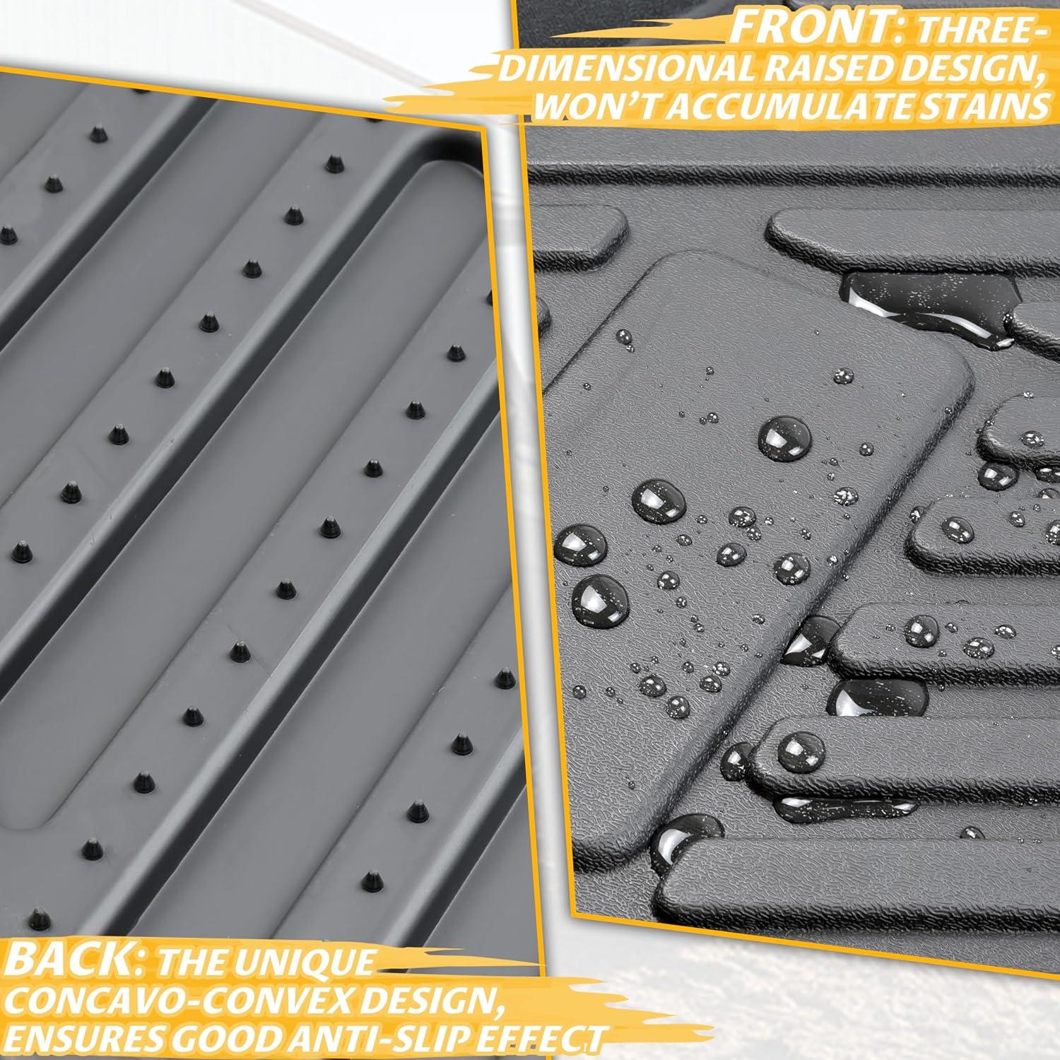 NON-SLIPPERY & EASY TO CLEAN – Work well with the vehicle, make sure to grip the carpet firmly and hold the mats in place, won't shift, keep the stability during the driving and ensure your driving safety; High-sided and three-dimensional raised design, won't accumulate stains, and if it is dirty, simply remove the floor liner from your vehicle and clean it off with a hose