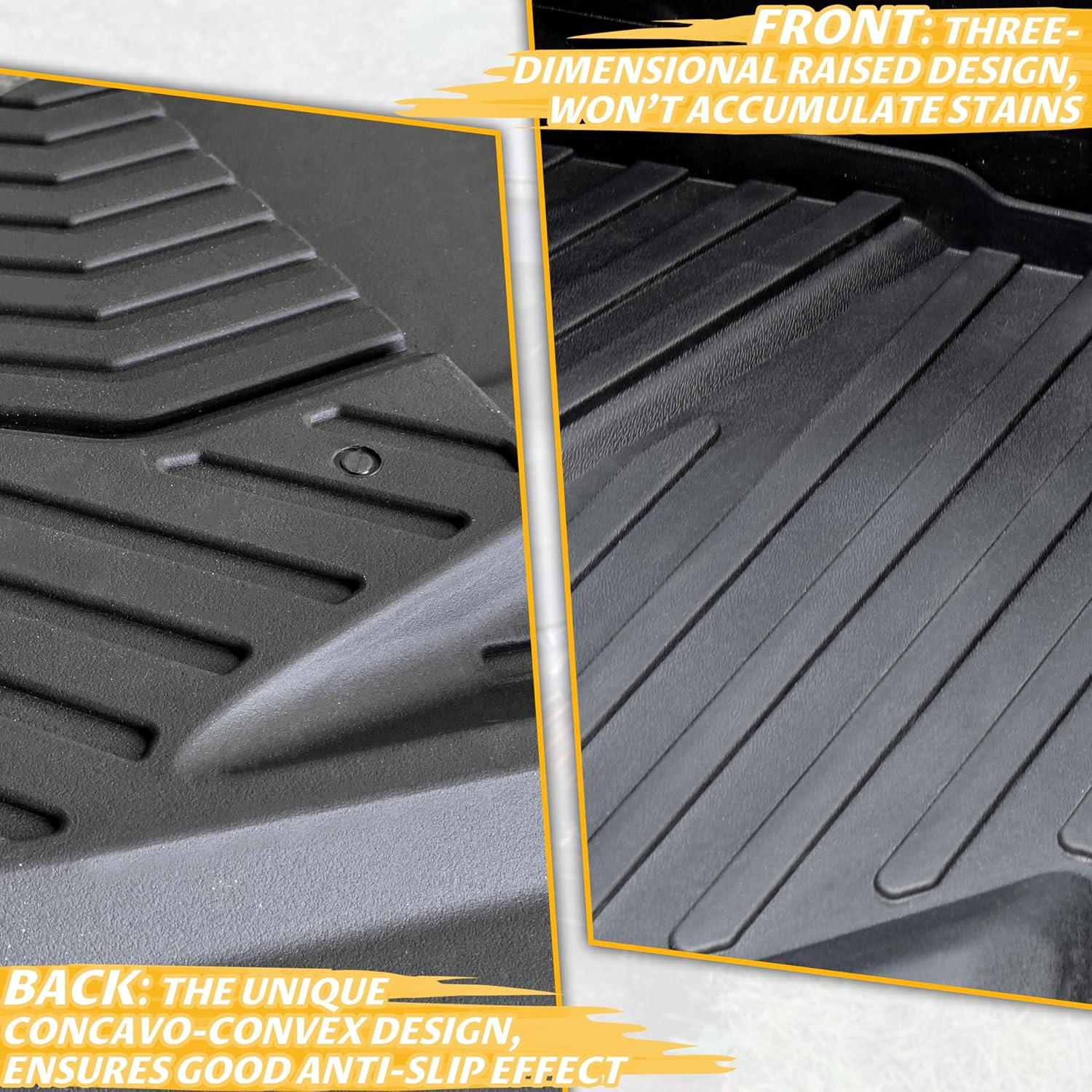 NON-SLIPPERY & EASY TO CLEAN – Work well with the vehicle, make sure to grip the carpet firmly and hold the mats in place, won't shift, keep the stability during the driving and ensure your driving safety; Three-dimensional raised design, won't accumulate stains, and if it is dirty, simply remove the floor liner from your vehicle and clean it off with a hose