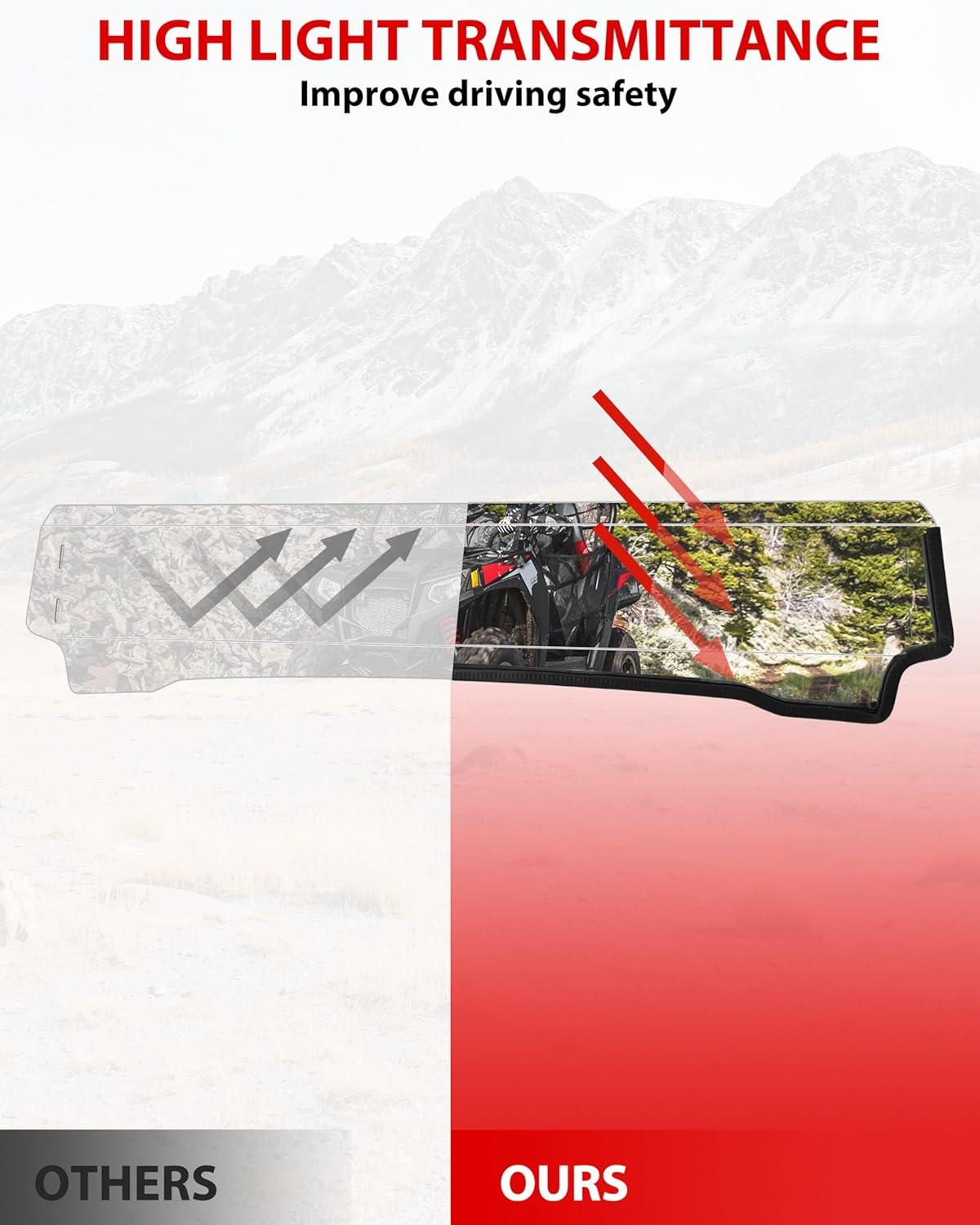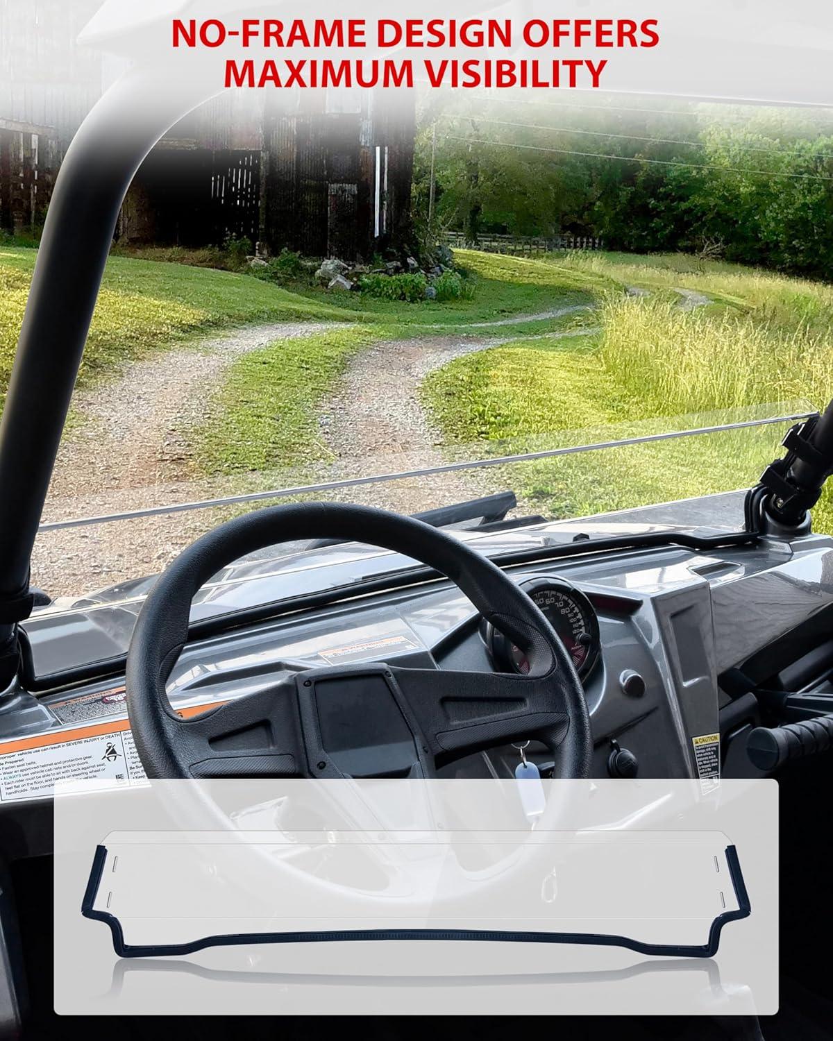 Half windshield improves driver and passenger safety while providing the unenclosed open air riding experience, the no-frame design offers maximum visibility