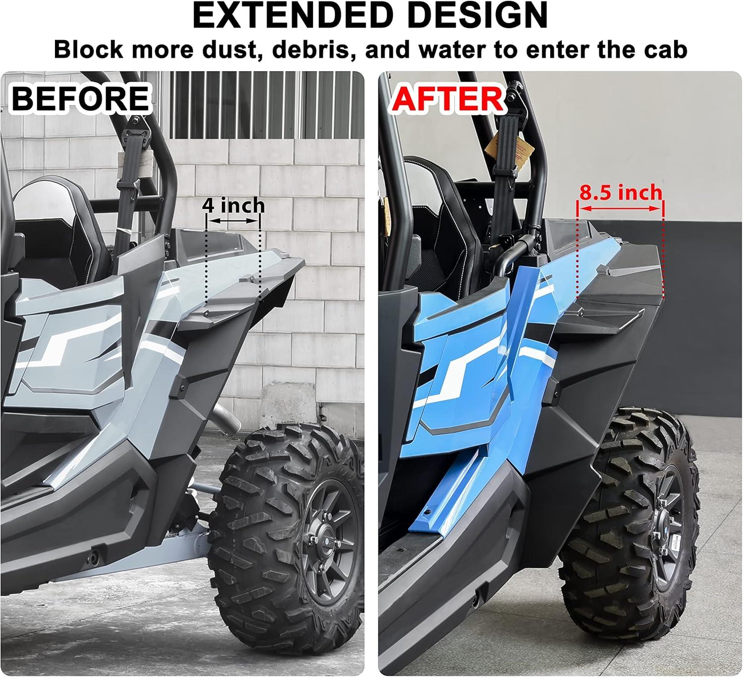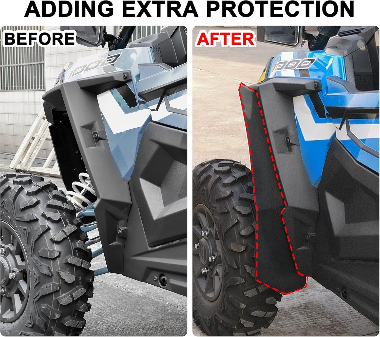 Front mud flaps install on the original factory fender flares, adding extra protection, rear wider fender flares install on the vehicle directly, rear extra-wide design(XXL) up to 8.5″ of width vs. the stock rear 4″; Extended mud flaps can block more dust, debris, and water to enter the cab, save a lot of wear and tear on you RZR, protect the occupants from rocks and debris being thrown up by your tires